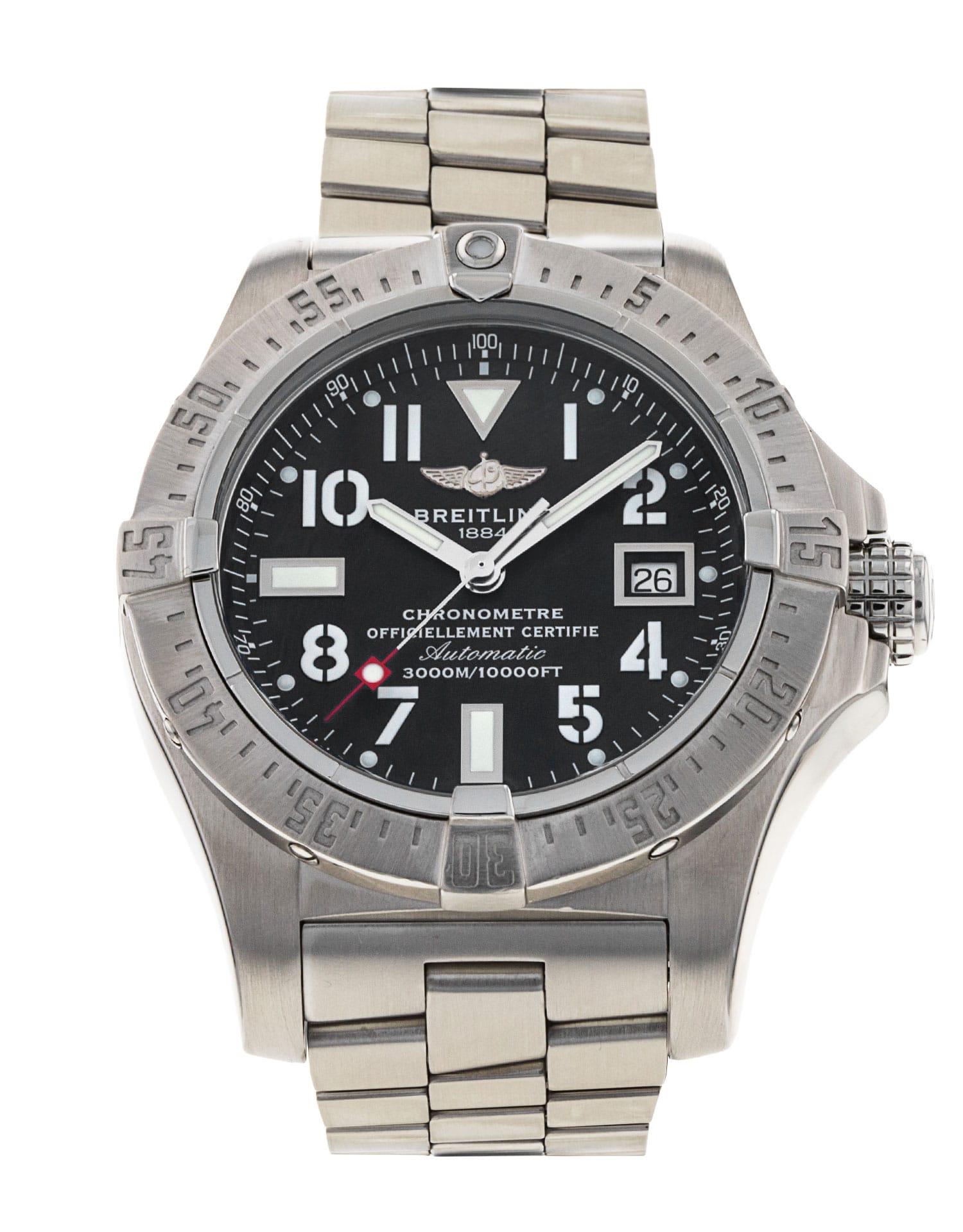 This Breitling Avenger Seawolf A17330 has a black arabic dial and a bracelet strap. This Breitling has undergone a thorough inspection of water resistance, accuracy, functionality and condition to determine the level of reconditioning required to meet our strict standards. It has also been referenced against technical documents and manufacturer records where available to ensure authenticity and a clean history. Our watches have a 24-month warranty for your peace of mind, in conjunction with any remaining manufacturer’s warranty from new or from service.