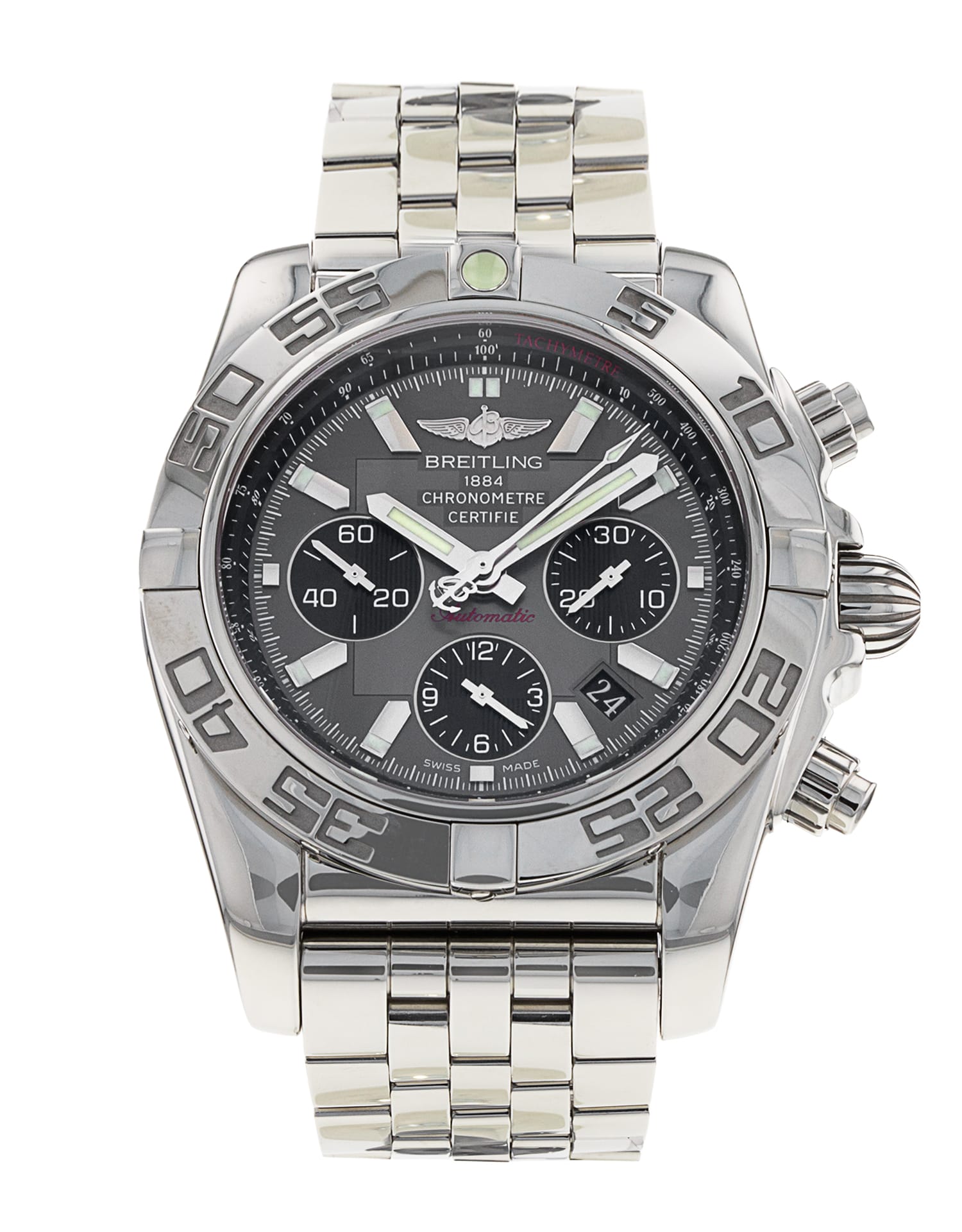 This Breitling Chronomat 44 AB0110 has a grey baton dial and a bracelet strap. This Breitling has undergone a thorough inspection of water resistance, accuracy, functionality and condition to determine the level of reconditioning required to meet our strict standards. It has also been referenced against technical documents and manufacturer records where available to ensure authenticity and a clean history. All our watches have a 24-month warranty for your peace of mind.