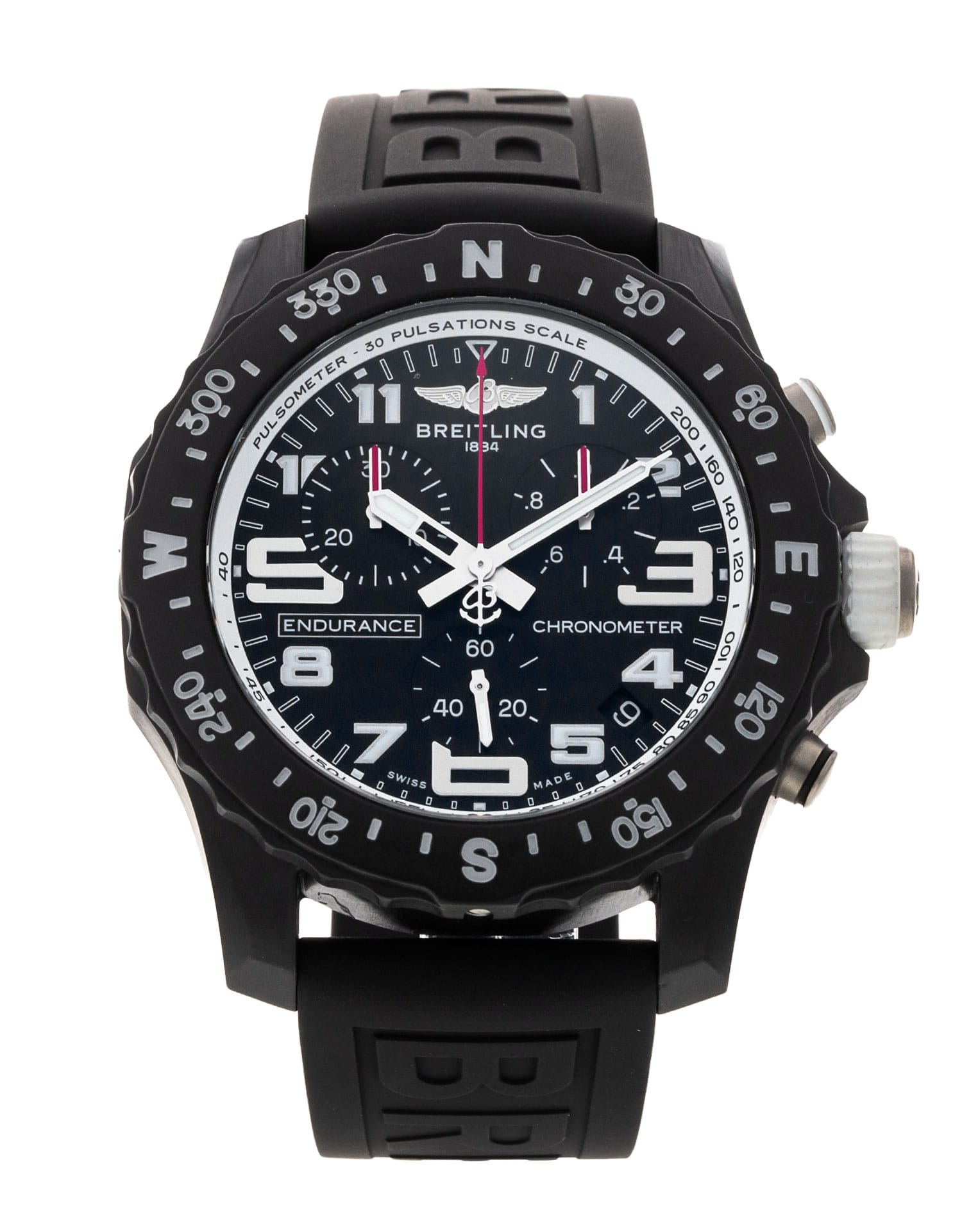 This Breitling Endurance Pro X82310 has a black arabic dial and a rubber strap. This Breitling has undergone a thorough inspection of water resistance, accuracy, functionality and condition to determine the level of reconditioning required to meet our strict standards. It has also been referenced against technical documents and manufacturer records where available to ensure authenticity and a clean history. Our watches have a 24-month warranty for your peace of mind, in conjunction with any remaining manufacturer’s warranty from new or from service.