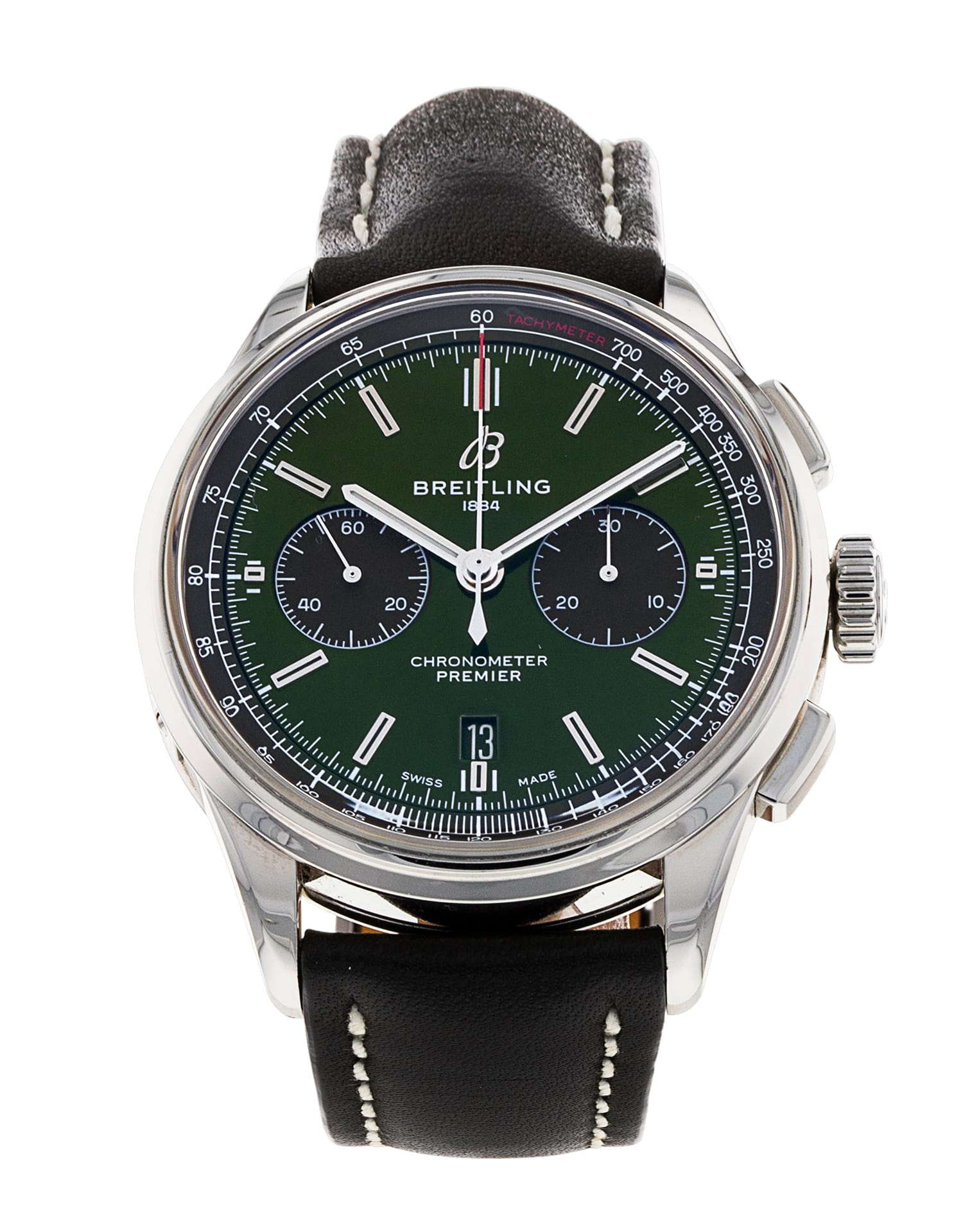 This Breitling Premier B01 AB0118 has a green baton dial and a leather strap. This Breitling has undergone a thorough inspection of water resistance, accuracy, functionality and condition to determine the level of reconditioning required to meet our strict standards. It has also been referenced against technical documents and manufacturer records where available to ensure authenticity and a clean history. All our watches have a 24-month warranty for your peace of mind.