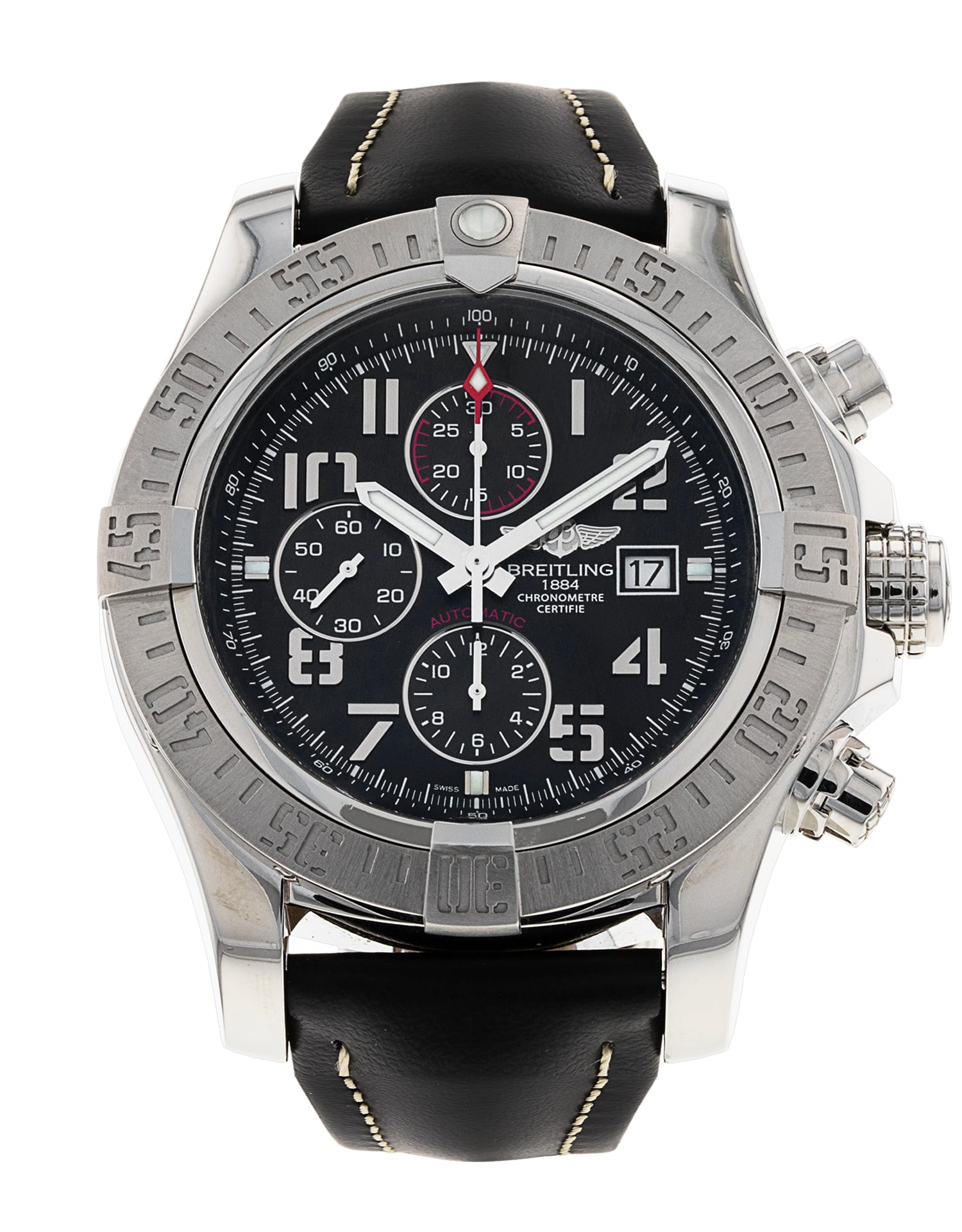 This Breitling Super Avenger II A13371 has a black arabic dial and a leather strap. This Breitling has undergone a thorough inspection of water resistance, accuracy, functionality and condition to determine the level of reconditioning required to meet our strict standards. It has also been referenced against technical documents and manufacturer records where available to ensure authenticity and a clean history. All our watches have a 24-month warranty for your peace of mind.