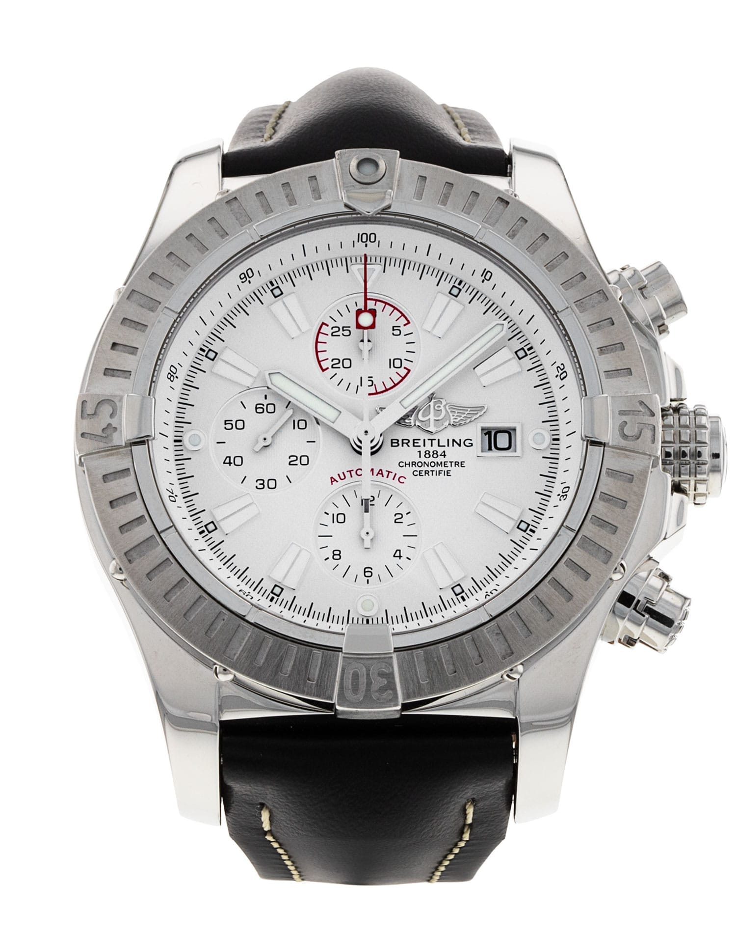 This Breitling Super Avenger A13370 has a white baton dial and a leather strap. This Breitling has undergone a thorough inspection of water resistance, accuracy, functionality and condition to determine the level of reconditioning required to meet our strict standards. It has also been referenced against technical documents and manufacturer records where available to ensure authenticity and a clean history. All our watches have a 24-month warranty for your peace of mind.