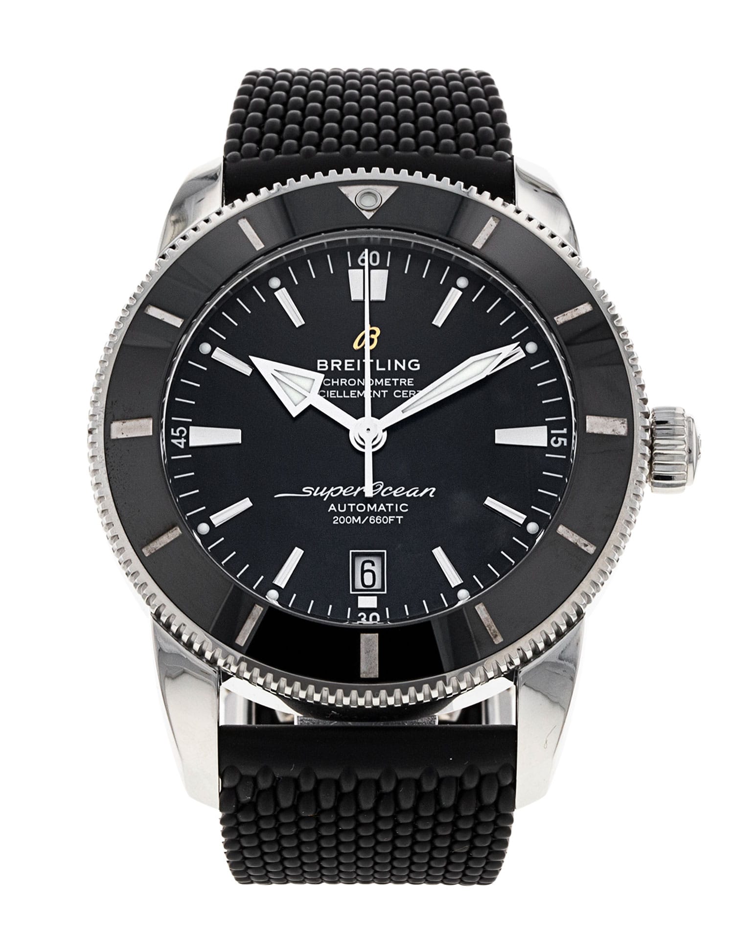 This Breitling SuperOcean Heritage B20 Automatic 46 AB2020 has a black baton dial and a rubber strap. This Breitling has undergone a thorough inspection of water resistance, accuracy, functionality and condition to determine the level of reconditioning required to meet our strict standards. It has also been referenced against technical documents and manufacturer records where available to ensure authenticity and a clean history. Our watches have a 24-month warranty for your peace of mind, in conjunction with any remaining manufacturer’s warranty from new or from service.