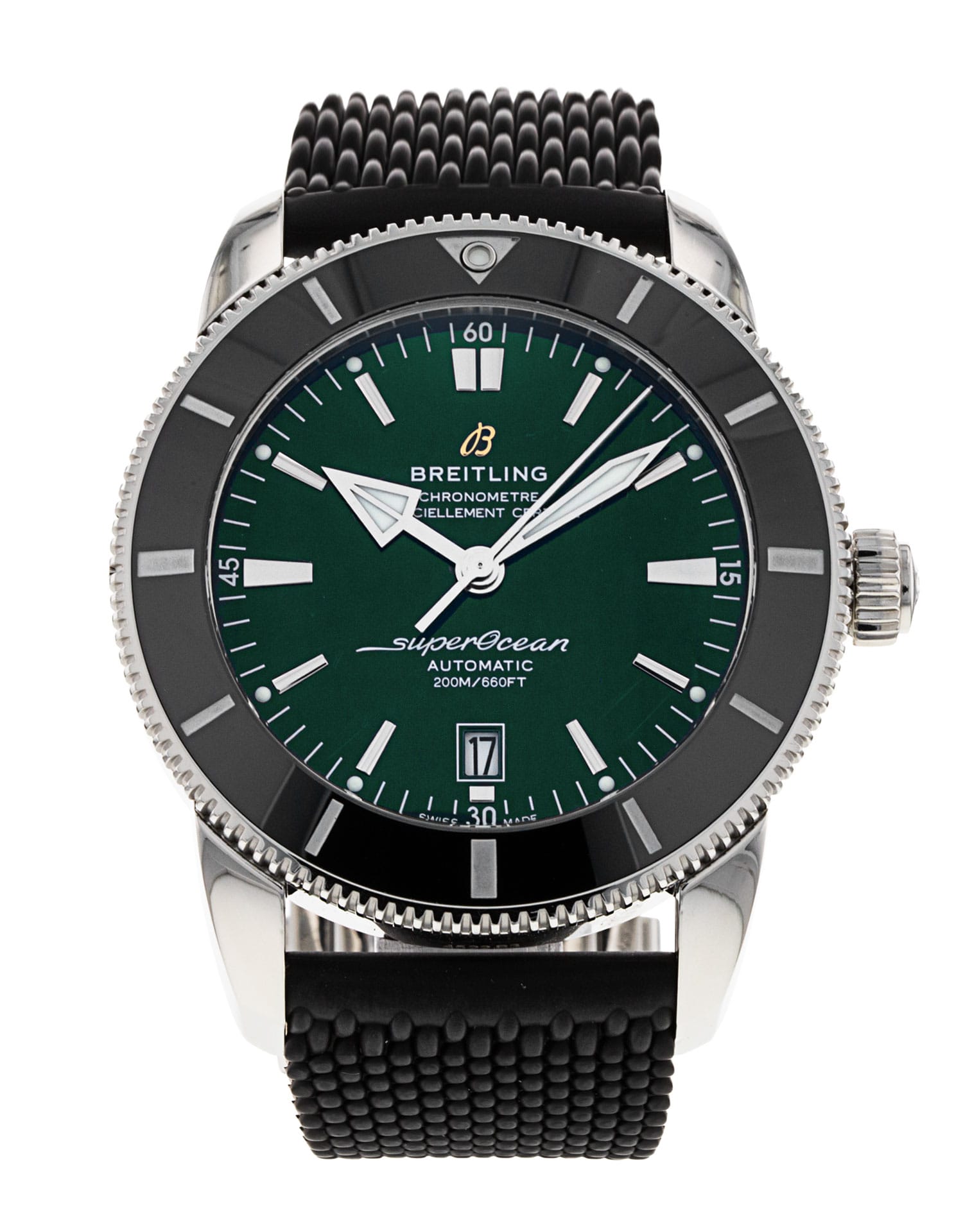 This Breitling SuperOcean Heritage B20 Automatic 46 AB2020 has a green dial and a rubber strap. This Breitling has undergone a thorough inspection of water resistance, accuracy, functionality and condition to determine the level of reconditioning required to meet our strict standards. It has also been referenced against technical documents and manufacturer records where available to ensure authenticity and a clean history. All our watches have a 24-month warranty for your peace of mind.