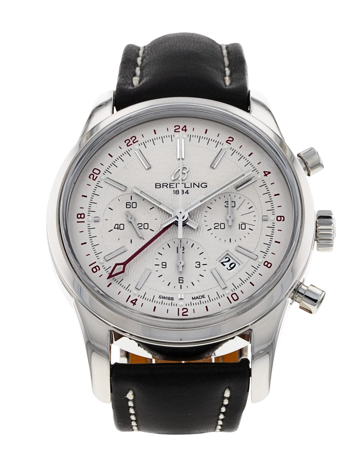 This Breitling Transocean Chronograph AB0451 has a silver baton dial and a leather strap. This Breitling has undergone a thorough inspection of water resistance, accuracy, functionality and condition to determine the level of reconditioning required to meet our strict standards. It has also been referenced against technical documents and manufacturer records where available to ensure authenticity and a clean history. All our watches have a 24-month warranty for your peace of mind.