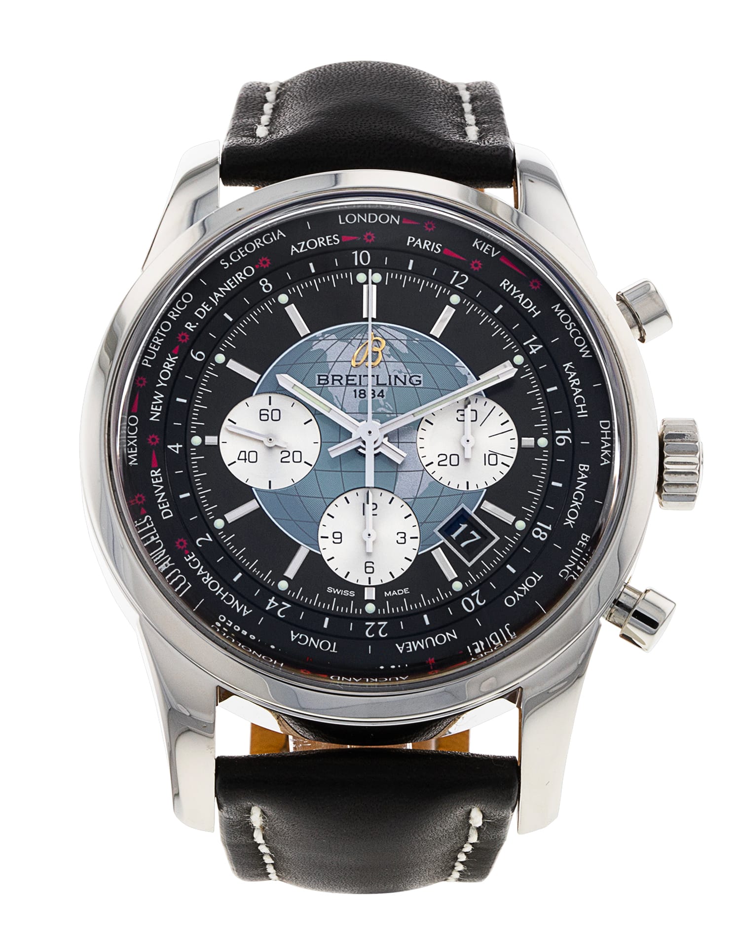 This Breitling Transocean Chronograph AB0510 has a black baton dial and a leather strap. This Breitling has undergone a thorough inspection of water resistance, accuracy, functionality and condition to determine the level of reconditioning required to meet our strict standards. It has also been referenced against technical documents and manufacturer records where available to ensure authenticity and a clean history. All our watches have a 24-month warranty for your peace of mind.