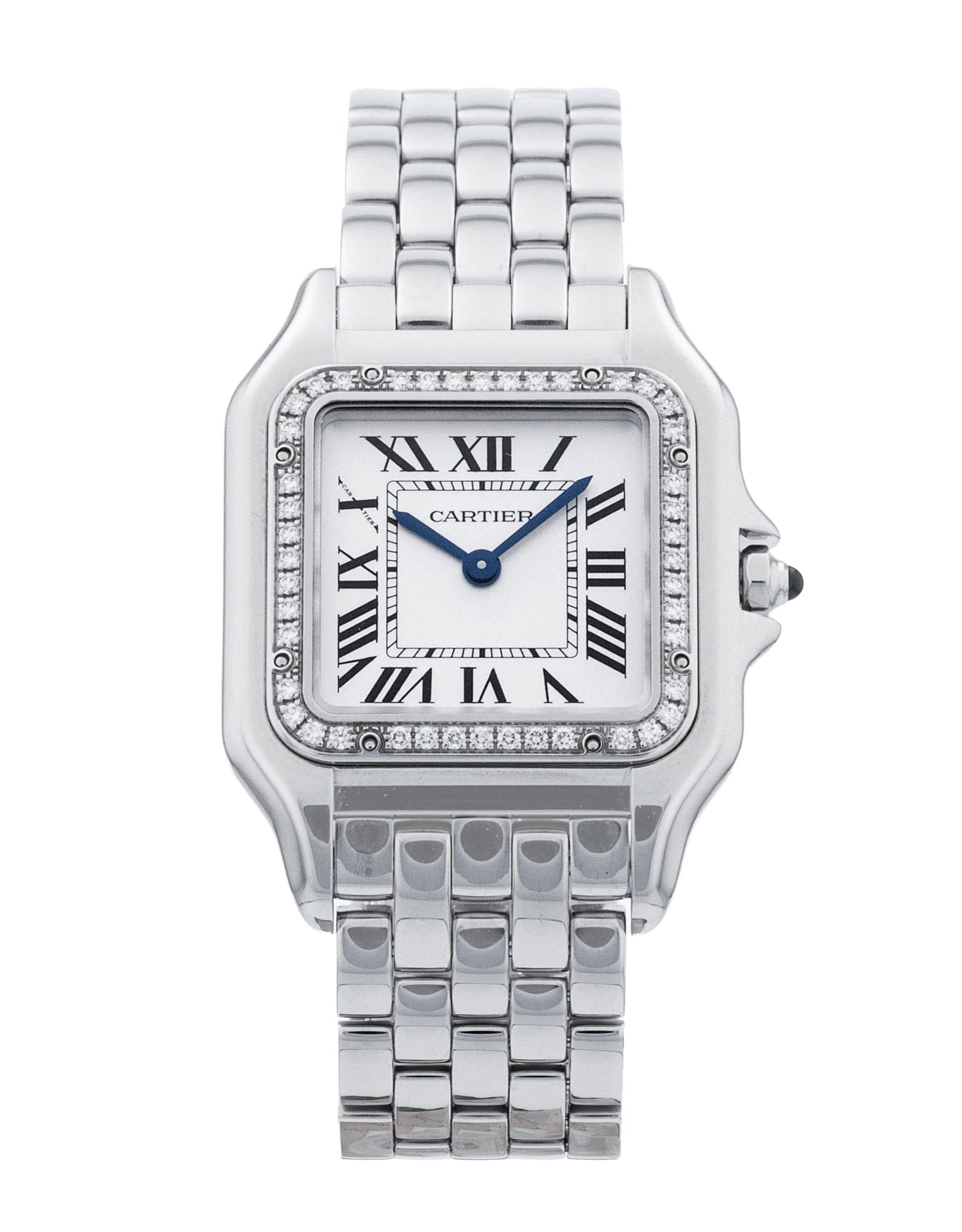 This Cartier Panthere De Cartier W4PN0008 has a silver roman numeral dial and a bracelet strap. This Cartier has undergone a thorough inspection of accuracy, functionality and condition at our Cartier certified service centre to determine the level of reconditioning required to meet our strict standards. It has also been checked against our records to ensure authenticity. Our watches have a 24-month warranty for your peace of mind, in conjunction with any remaining manufacturer’s warranty from new or from service.