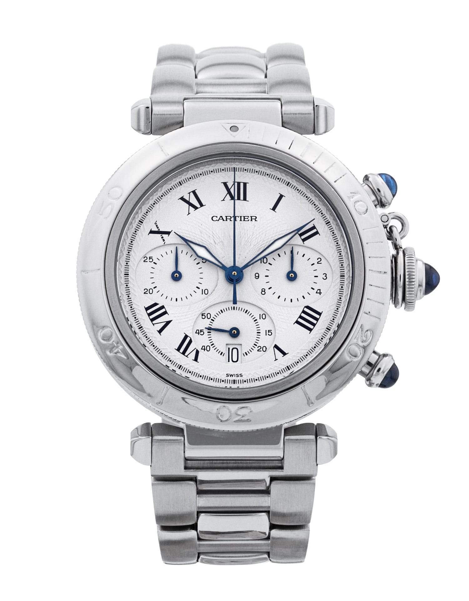 This Cartier Pasha W3101855 has a silver roman numeral dial and a bracelet strap. This Cartier has undergone a thorough inspection of accuracy, functionality and condition at our Cartier certified service centre to determine the level of reconditioning required to meet our strict standards. It has also been checked against our records to ensure authenticity. All our watches have a 24-month warranty for your peace of mind.