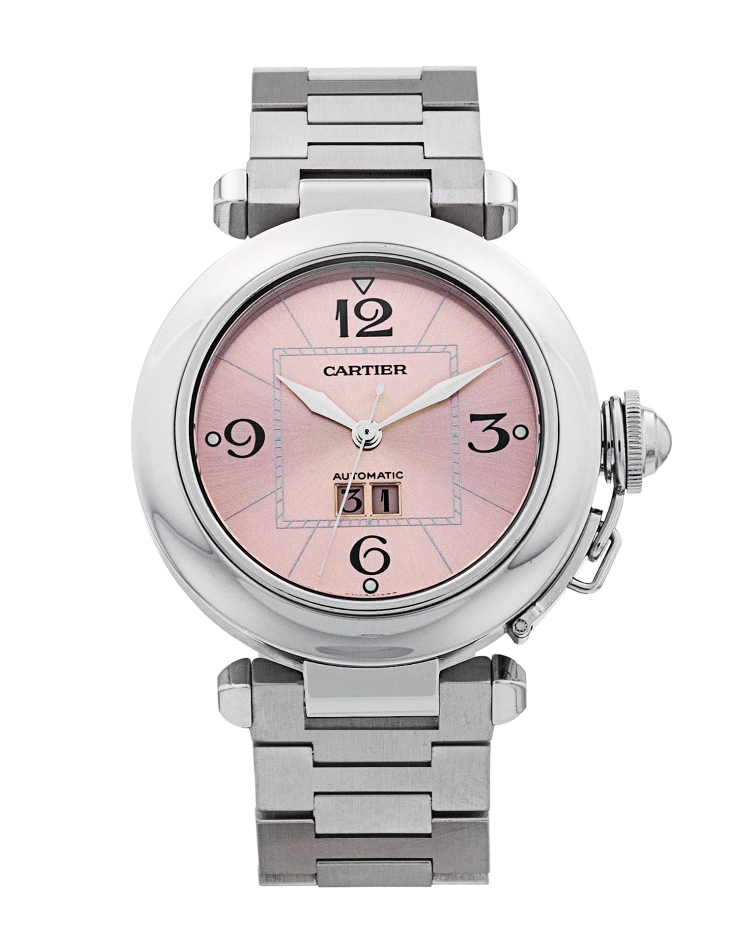 This Cartier Pasha W31058M7 has a pink quarter arabic dial and a bracelet strap. This Cartier has undergone a thorough inspection of accuracy, functionality and condition at our Cartier certified service centre to determine the level of reconditioning required to meet our strict standards. It has also been checked against our records to ensure authenticity. All our watches have a 24-month warranty for your peace of mind.