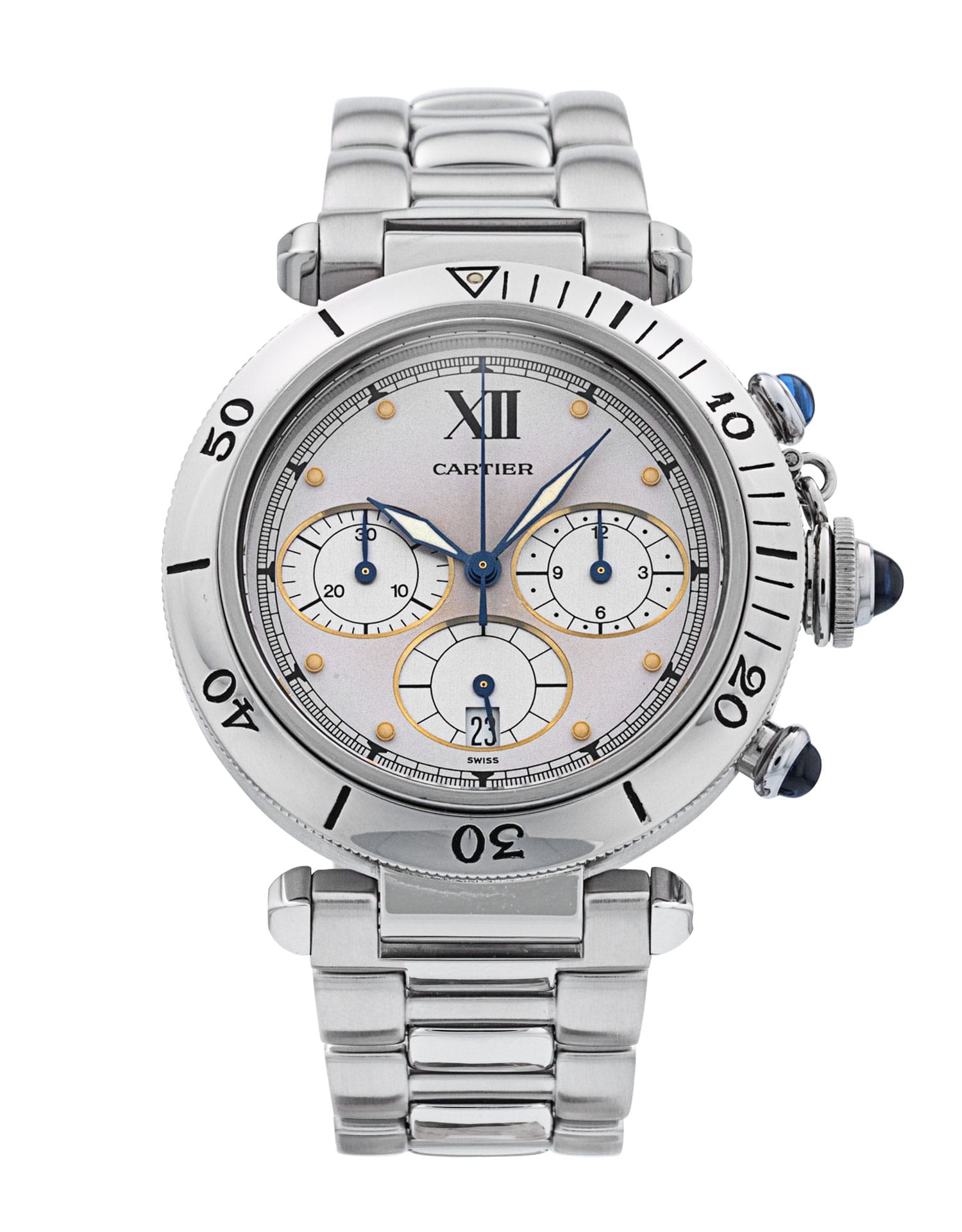 This Cartier Pasha W31004H3 has a silver dial and a bracelet strap. This Cartier has undergone a thorough inspection of accuracy, functionality and condition at our Cartier certified service centre to determine the level of reconditioning required to meet our strict standards. It has also been checked against our records to ensure authenticity. All our watches have a 24-month warranty for your peace of mind.