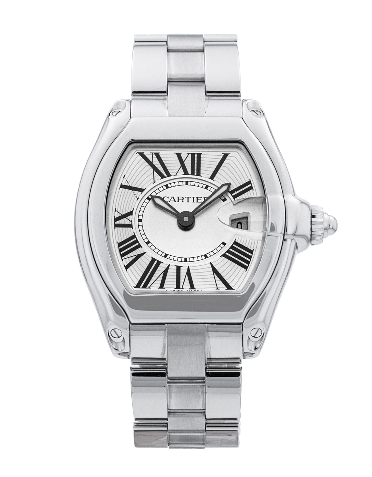 This Cartier Roadster W62016V3 has a silver roman numeral dial and a bracelet strap. This Cartier has undergone a thorough inspection of accuracy, functionality and condition at our Cartier certified service centre to determine the level of reconditioning required to meet our strict standards. It has also been checked against our records to ensure authenticity. All our watches have a 24-month warranty for your peace of mind.