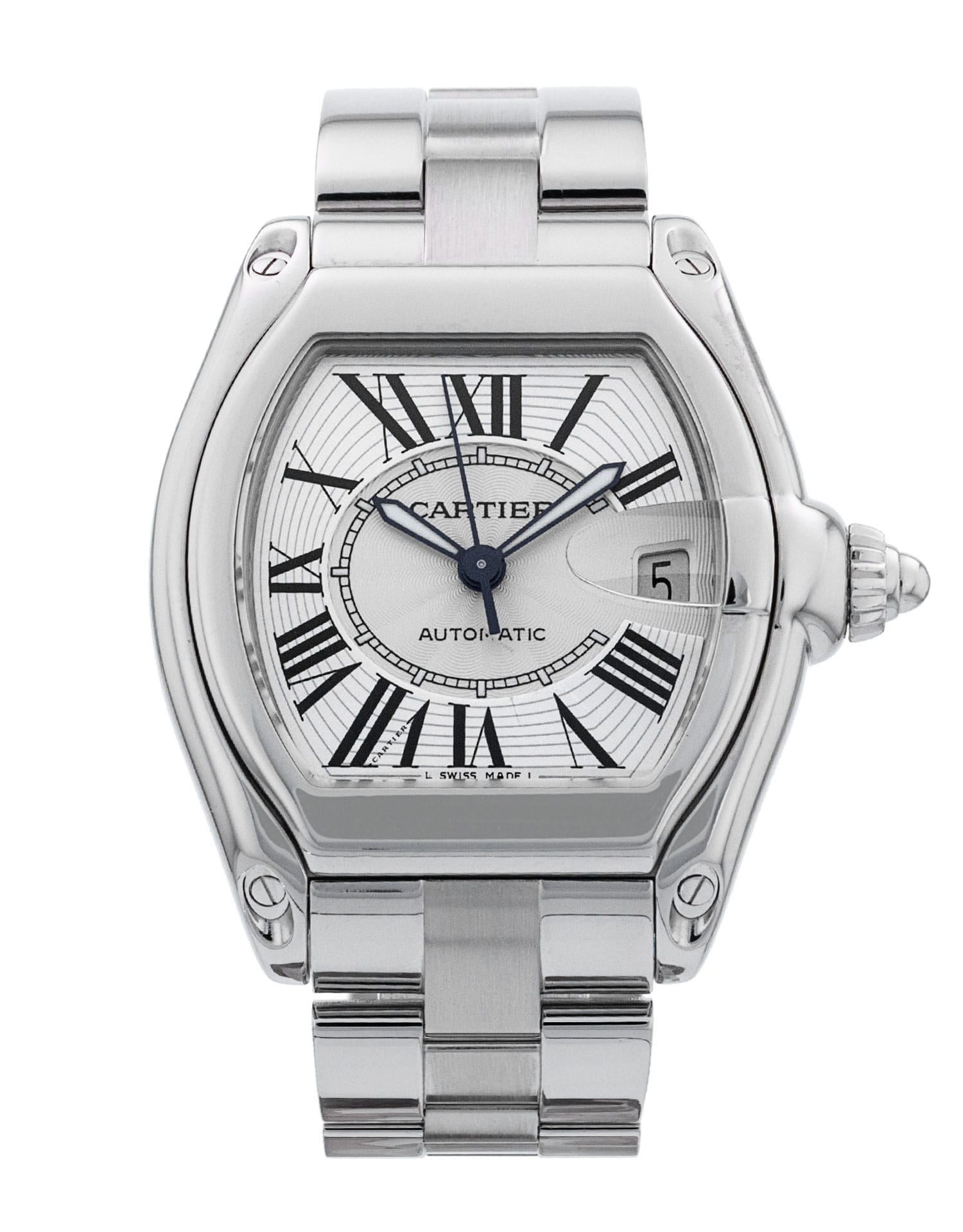 This Cartier Roadster W62025V3 has a silver roman numeral dial and a bracelet strap. This Cartier has undergone a thorough inspection of accuracy, functionality and condition at our Cartier certified service centre to determine the level of reconditioning required to meet our strict standards. It has also been checked against our records to ensure authenticity. All our watches have a 24-month warranty for your peace of mind.