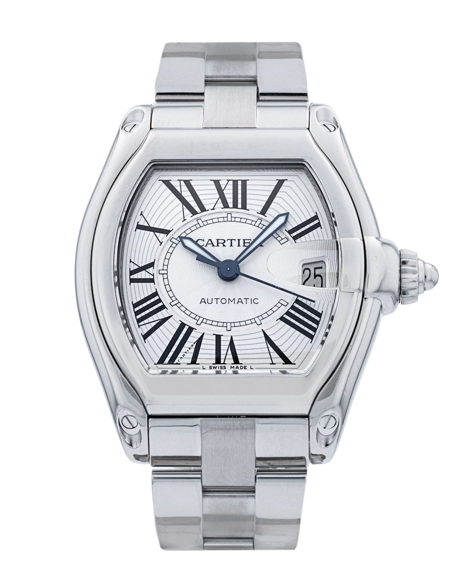 This Cartier Roadster W62025V3 has a silver roman numeral dial and a bracelet strap. This Cartier has undergone a thorough inspection of accuracy, functionality and condition at our Cartier certified service centre to determine the level of reconditioning required to meet our strict standards. It has also been checked against our records to ensure authenticity. All our watches have a 24-month warranty for your peace of mind.