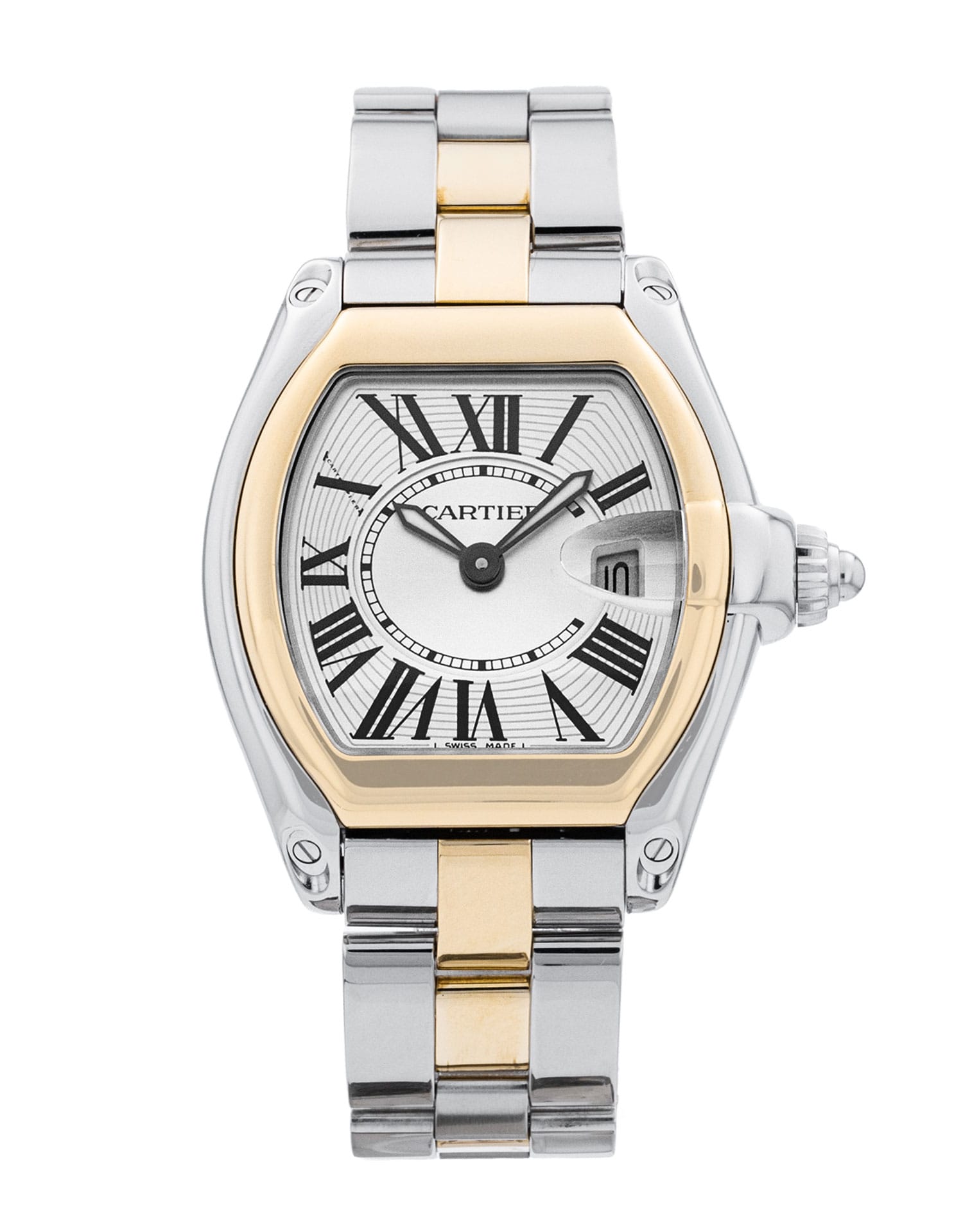 This Cartier Roadster W62026Y4 has a silver roman numeral dial and a bracelet strap. This Cartier has undergone a thorough inspection of accuracy, functionality and condition at our Cartier certified service centre to determine the level of reconditioning required to meet our strict standards. It has also been checked against our records to ensure authenticity. All our watches have a 24-month warranty for your peace of mind.