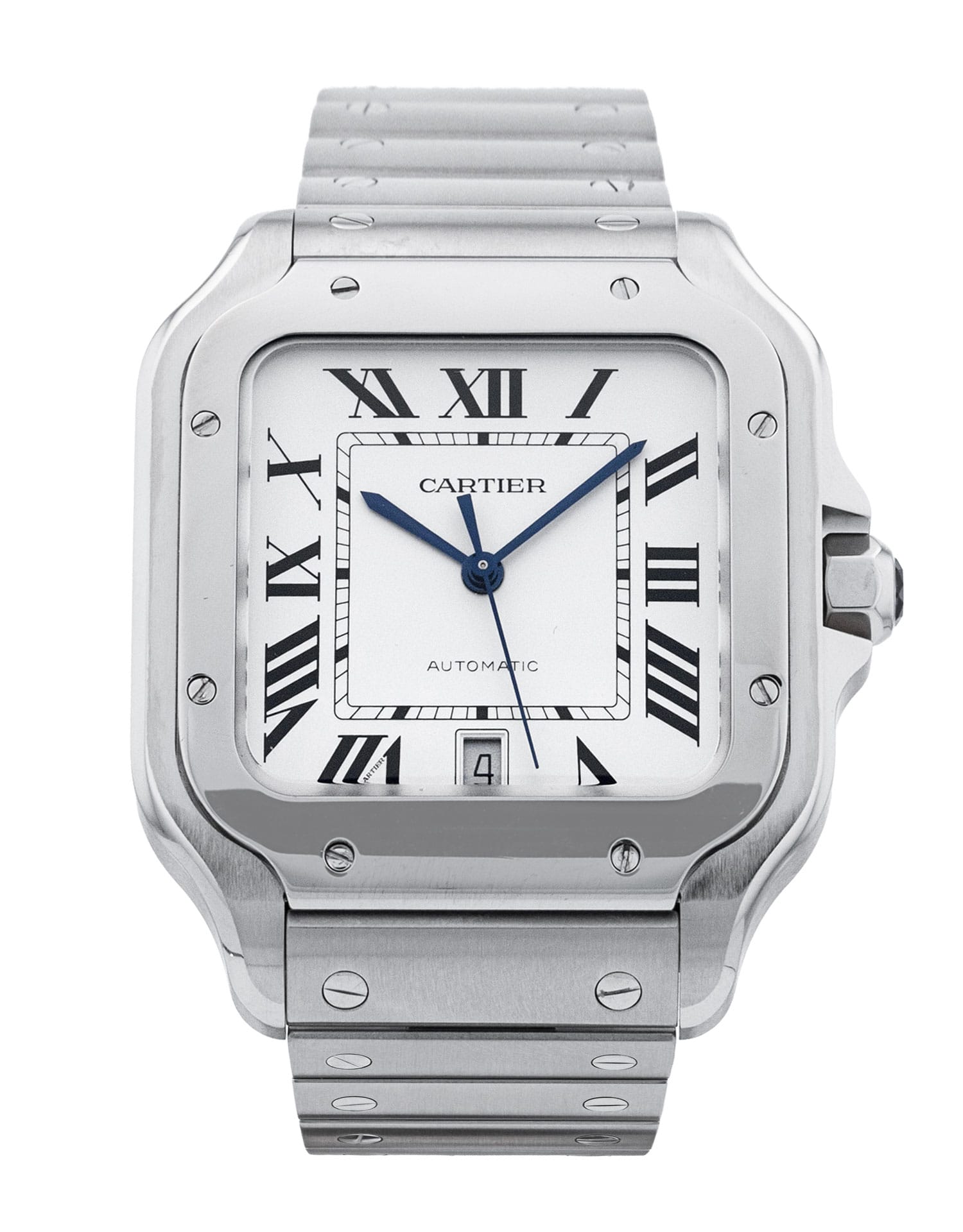 This Cartier Santos De Cartier WSSA0018 has a silver roman numeral dial and a bracelet strap. This Cartier has undergone a thorough inspection of accuracy, functionality and condition at our Cartier certified service centre to determine the level of reconditioning required to meet our strict standards. It has also been checked against our records to ensure authenticity. Our watches have a 24-month warranty for your peace of mind, in conjunction with any remaining manufacturer’s warranty from new or from service.