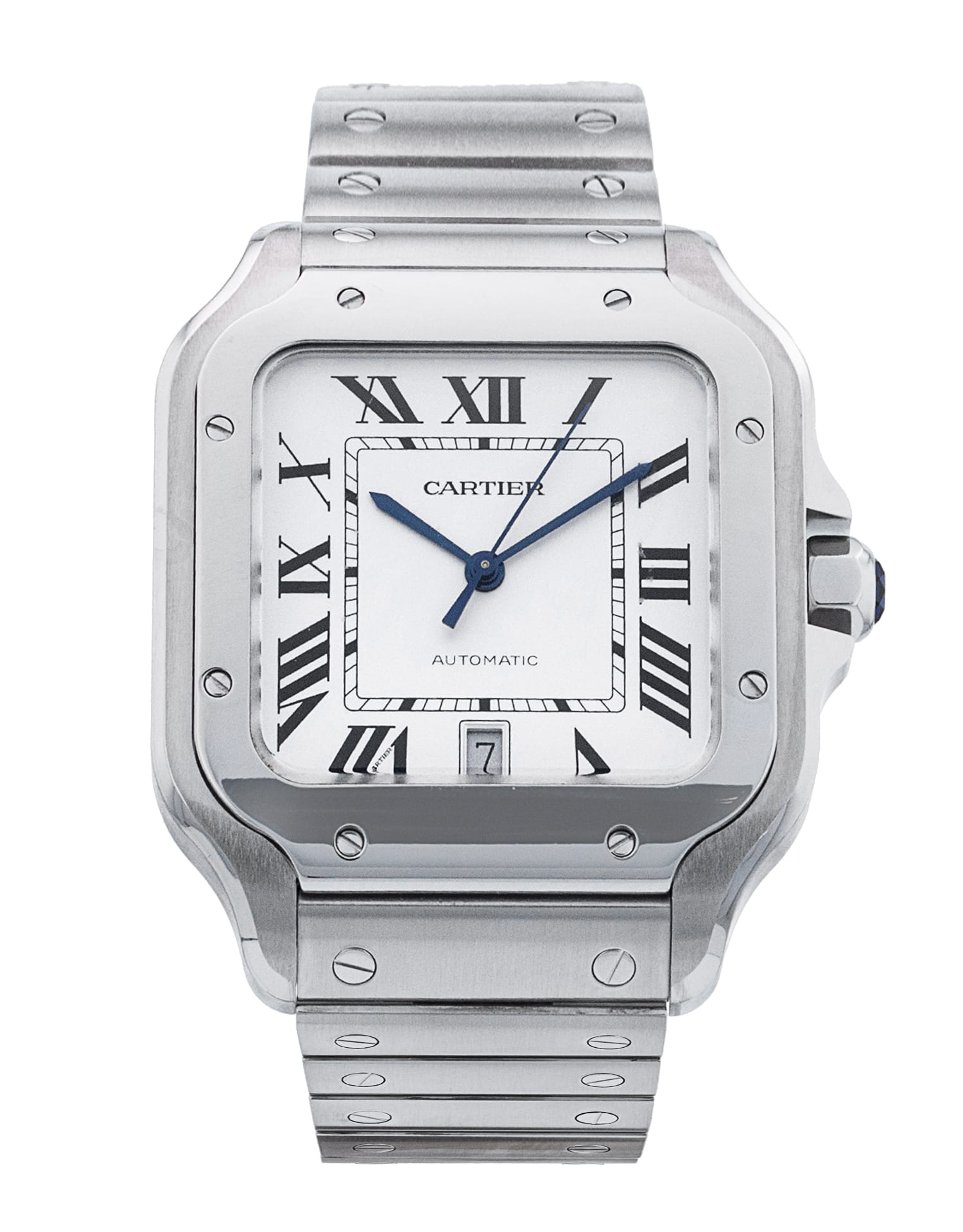 This Cartier Santos De Cartier WSSA0018 has a silver roman numeral dial and a bracelet strap. This Cartier has undergone a thorough inspection of accuracy, functionality and condition at our Cartier certified service centre to determine the level of reconditioning required to meet our strict standards. It has also been checked against our records to ensure authenticity. All our watches have a 24-month warranty for your peace of mind.