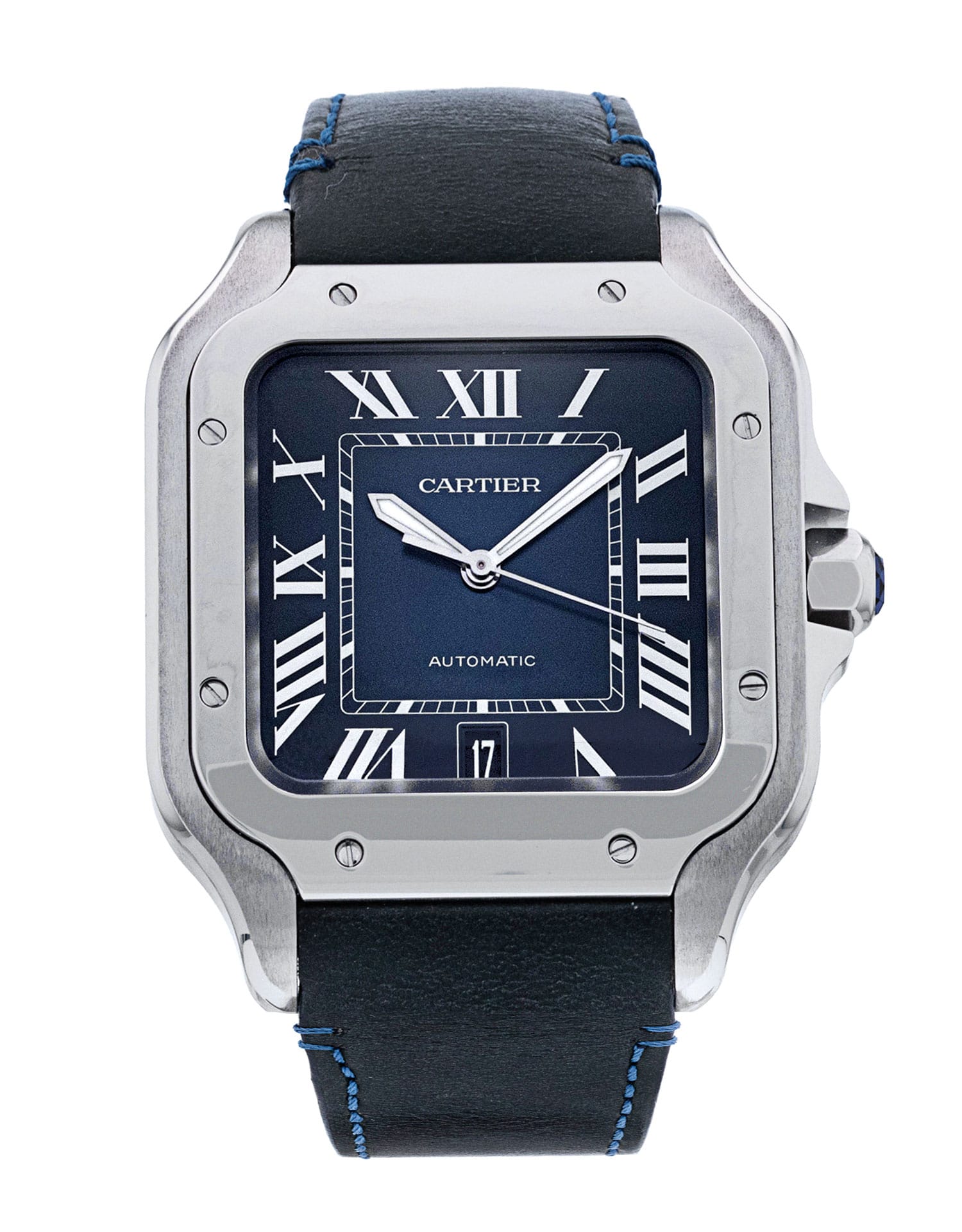 This Cartier Santos De Cartier WSSA0030 has a blue roman numeral dial and a leather strap. This Cartier has undergone a thorough inspection of accuracy, functionality and condition at our Cartier certified service centre to determine the level of reconditioning required to meet our strict standards. It has also been checked against our records to ensure authenticity. All our watches have a 24-month warranty for your peace of mind.