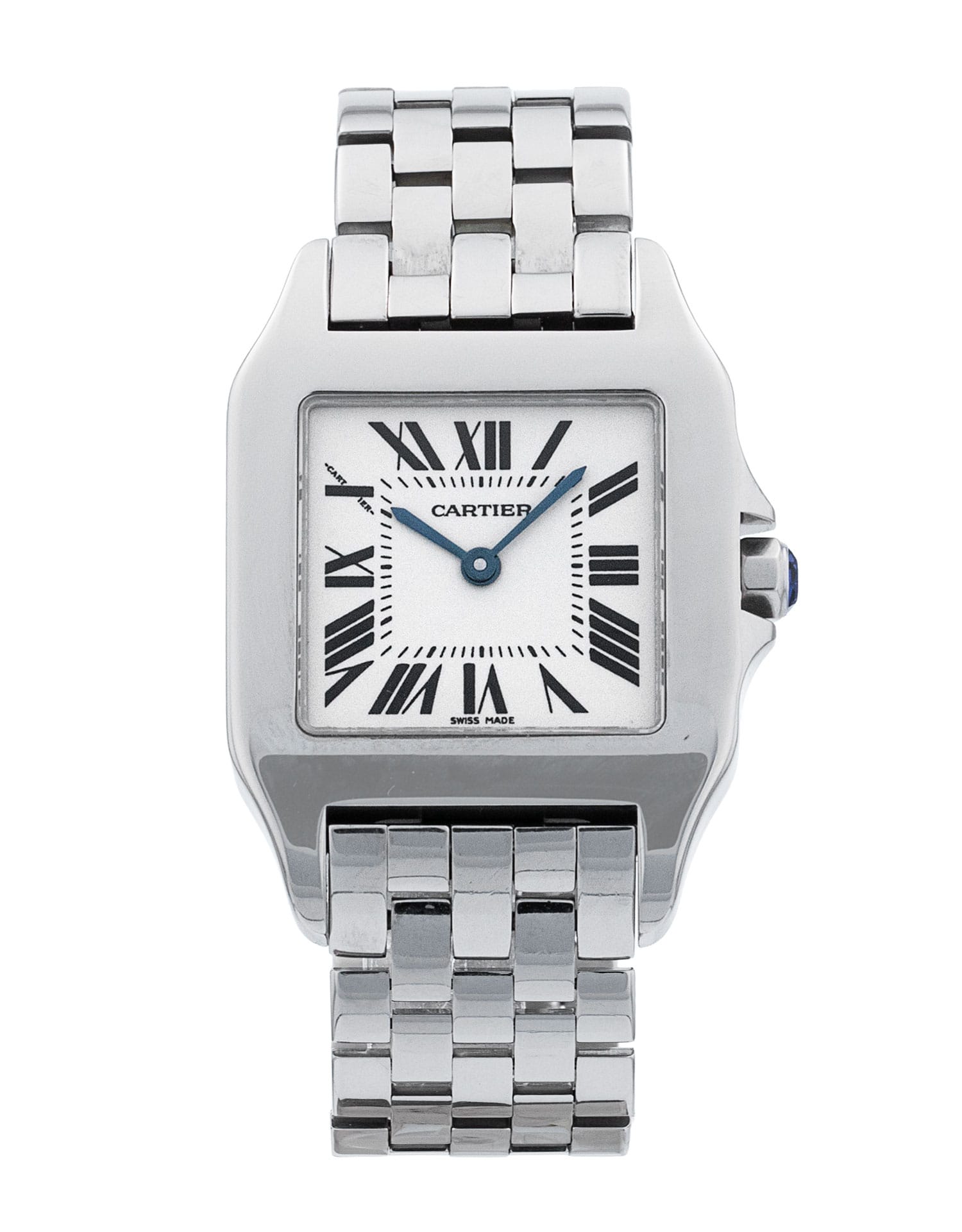 This Cartier Santos Demoiselle W25065Z5 has a silver roman numeral dial and a bracelet strap. This Cartier has undergone a thorough inspection of accuracy, functionality and condition at our Cartier certified service centre to determine the level of reconditioning required to meet our strict standards. It has also been checked against our records to ensure authenticity. All our watches have a 24-month warranty for your peace of mind.