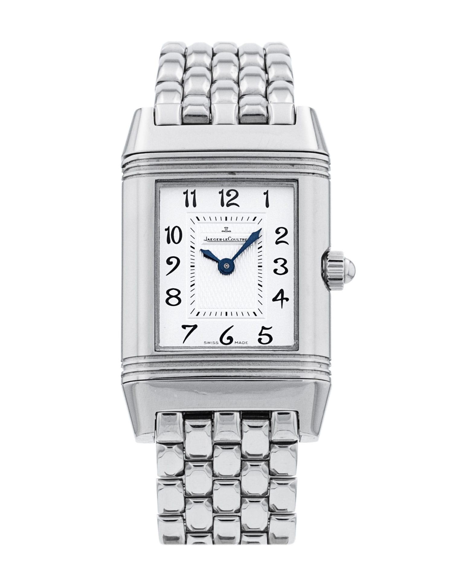 This Jaeger-LeCoultre Reverso Duetto 2668110 has a white arabic dial and a bracelet strap. This Jaeger-LeCoultre has undergone a thorough inspection of accuracy, functionality and condition at our Jaeger-LeCoultre certified service centre to determine the level of reconditioning required to meet our strict standards. It has also been checked against our records to ensure authenticity. All our watches have a 24-month warranty for your peace of mind.