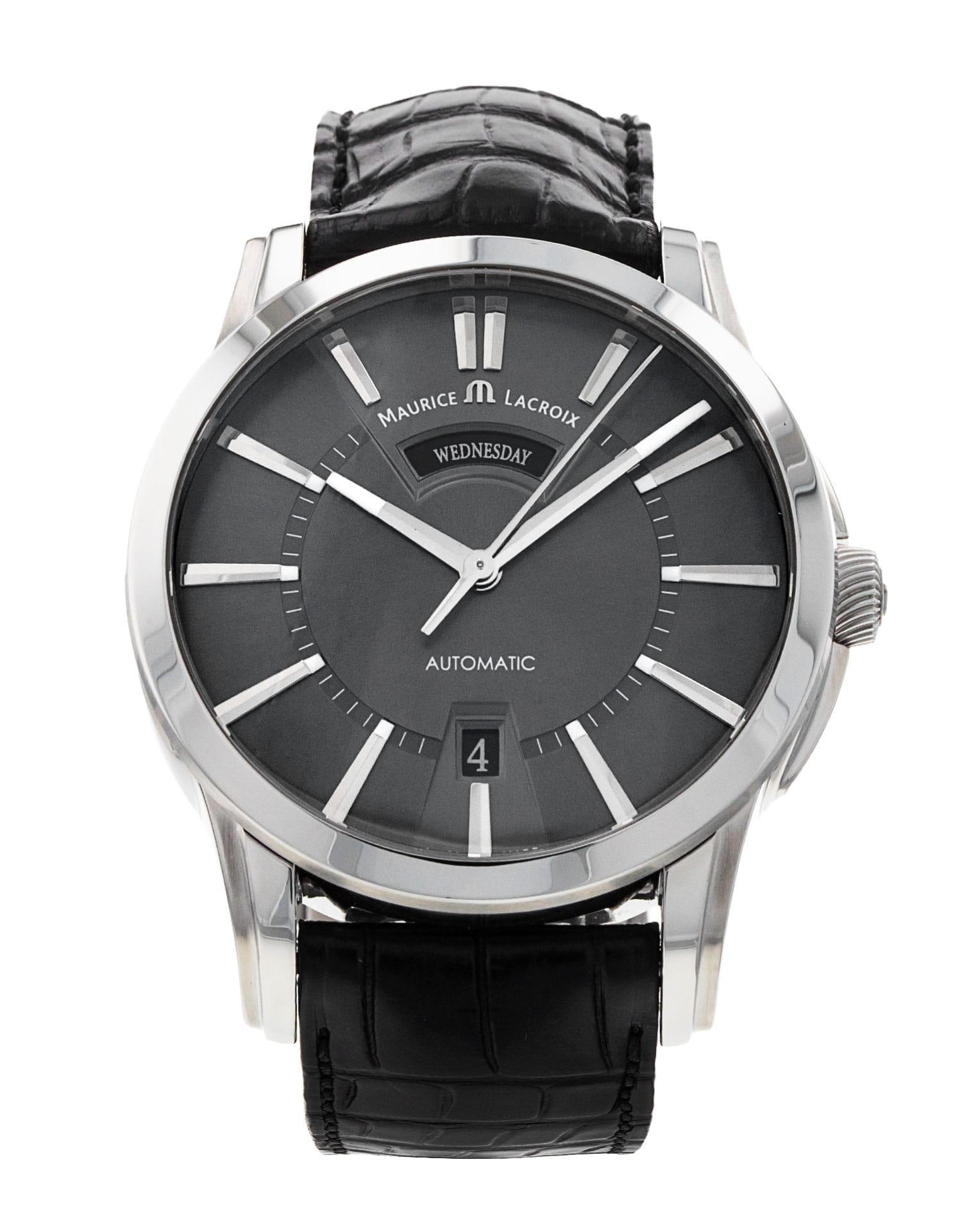 This Maurice Lacroix Pontos Day-Date PT6158-SS001-23E has a slate baton dial and a leather strap. This Maurice Lacroix has undergone a thorough inspection of water resistance, accuracy, functionality and condition to determine the level of reconditioning required to meet our strict standards. It has also been referenced against technical documents and manufacturer records where available to ensure authenticity and a clean history. All our watches have a 24-month warranty for your peace of mind.