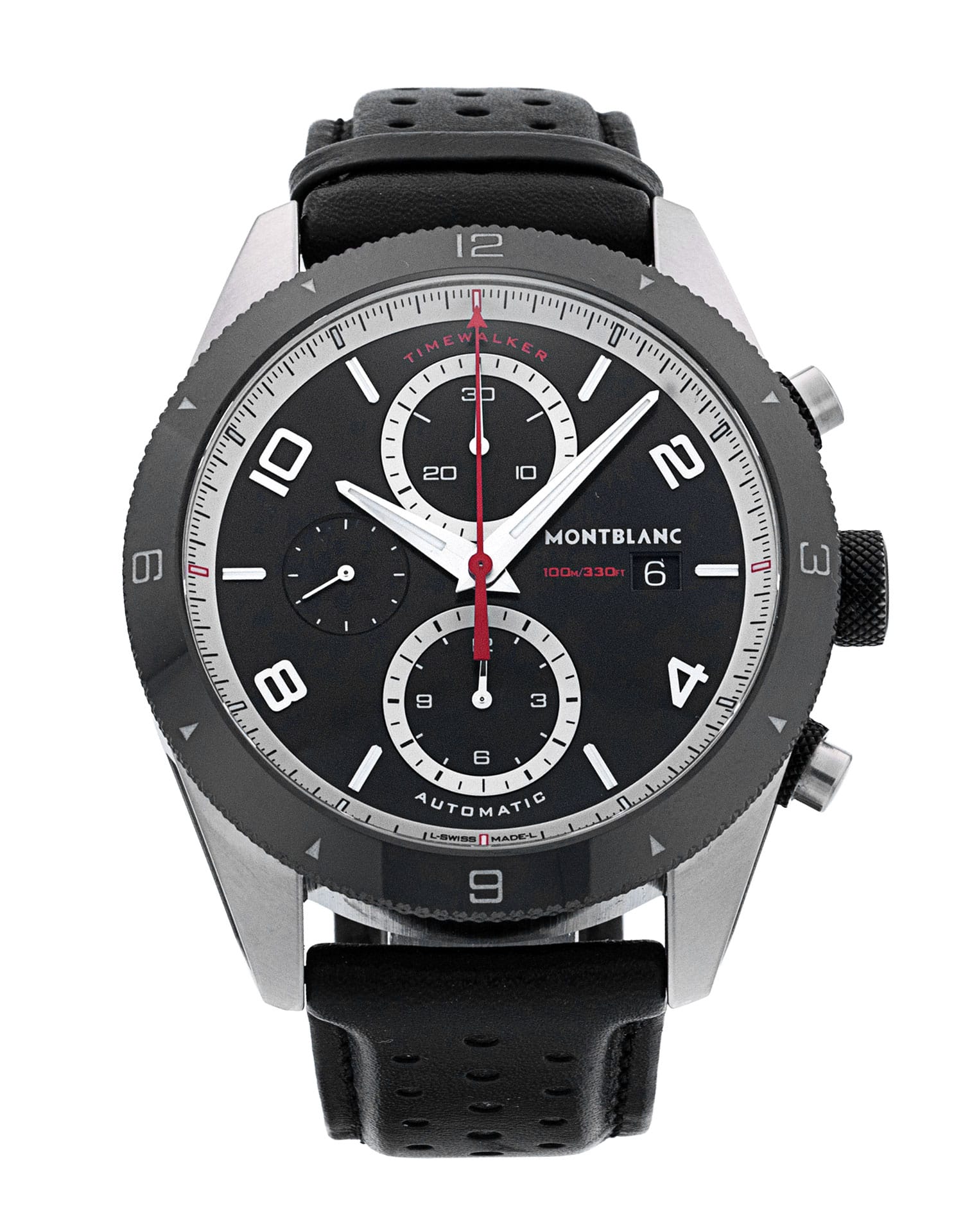 This Montblanc TimeWalker 116098 has a black arabic dial and a leather strap. This Montblanc has undergone a thorough inspection of water resistance, accuracy, functionality and condition to determine the level of reconditioning required to meet our strict standards. It has also been referenced against technical documents and manufacturer records where available to ensure authenticity and a clean history. All our watches have a 24-month warranty for your peace of mind.