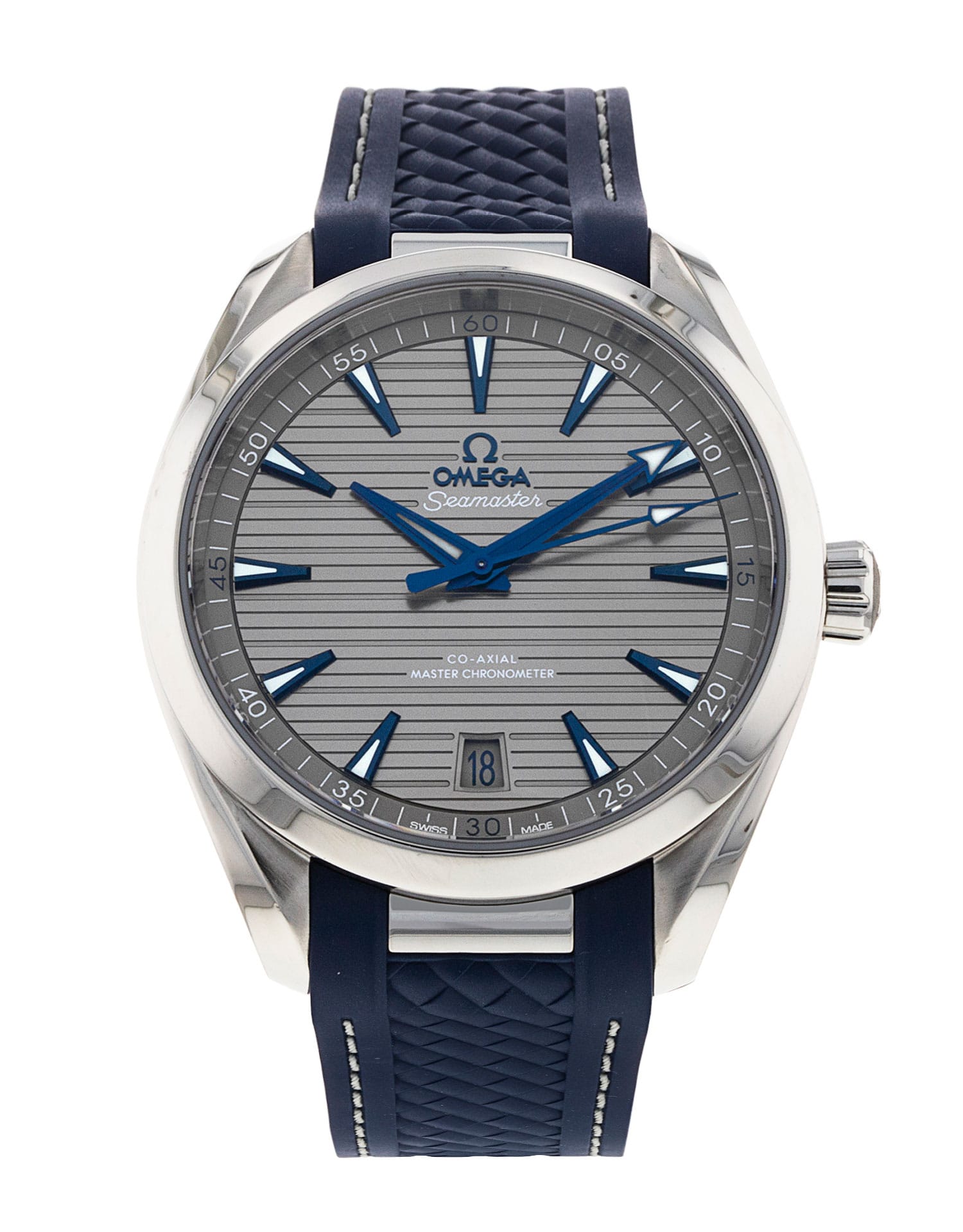 This Omega Aqua Terra 150m Gents 220.10.41.21.06.001 has a grey baton dial and a rubber strap. This Omega has undergone a thorough inspection of accuracy, functionality and condition at our Omega certified service centre to determine the level of reconditioning required to meet our strict standards. It has also been checked against our records to ensure authenticity. All our watches have a 24-month warranty for your peace of mind.