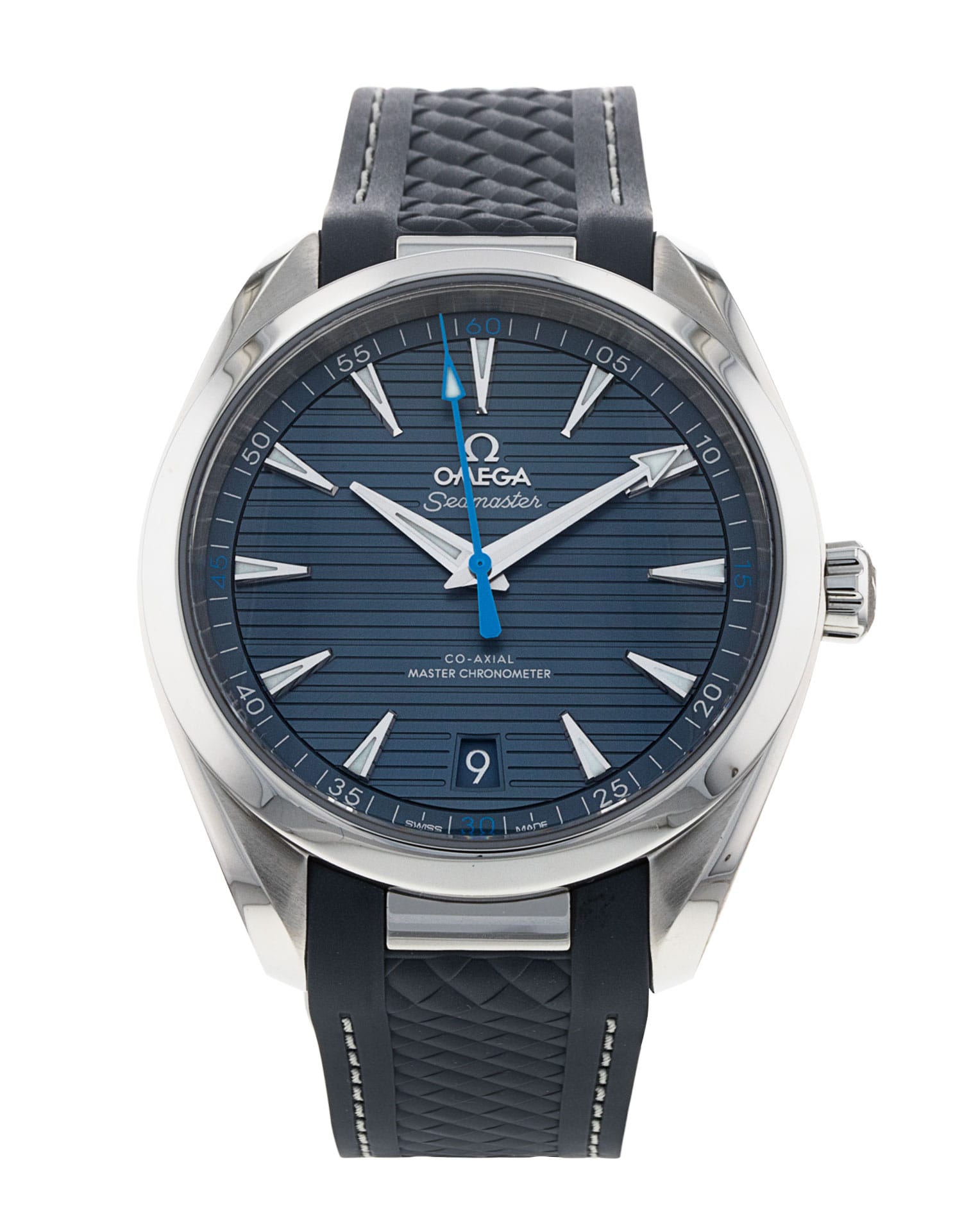 This Omega Aqua Terra 150m Gents 220.12.41.21.03.002 has a blue baton dial and a rubber strap. This Omega has undergone a thorough inspection of accuracy, functionality and condition at our Omega certified service centre to determine the level of reconditioning required to meet our strict standards. It has also been checked against our records to ensure authenticity. Our watches have a 24-month warranty for your peace of mind, in conjunction with any remaining manufacturer’s warranty from new or from service.