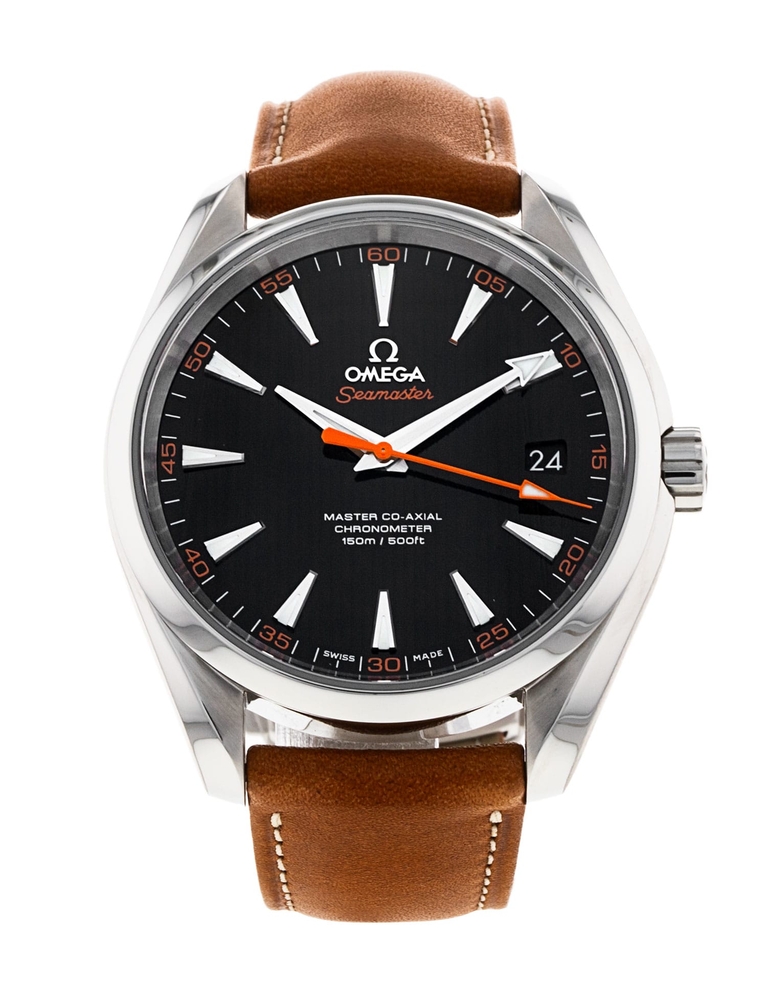 This Omega Aqua Terra 150m Gents 231.12.42.21.01.002 has a black baton dial and a leather strap. This Omega has undergone a thorough inspection of accuracy, functionality and condition at our Omega certified service centre to determine the level of reconditioning required to meet our strict standards. It has also been checked against our records to ensure authenticity. All our watches have a 24-month warranty for your peace of mind.