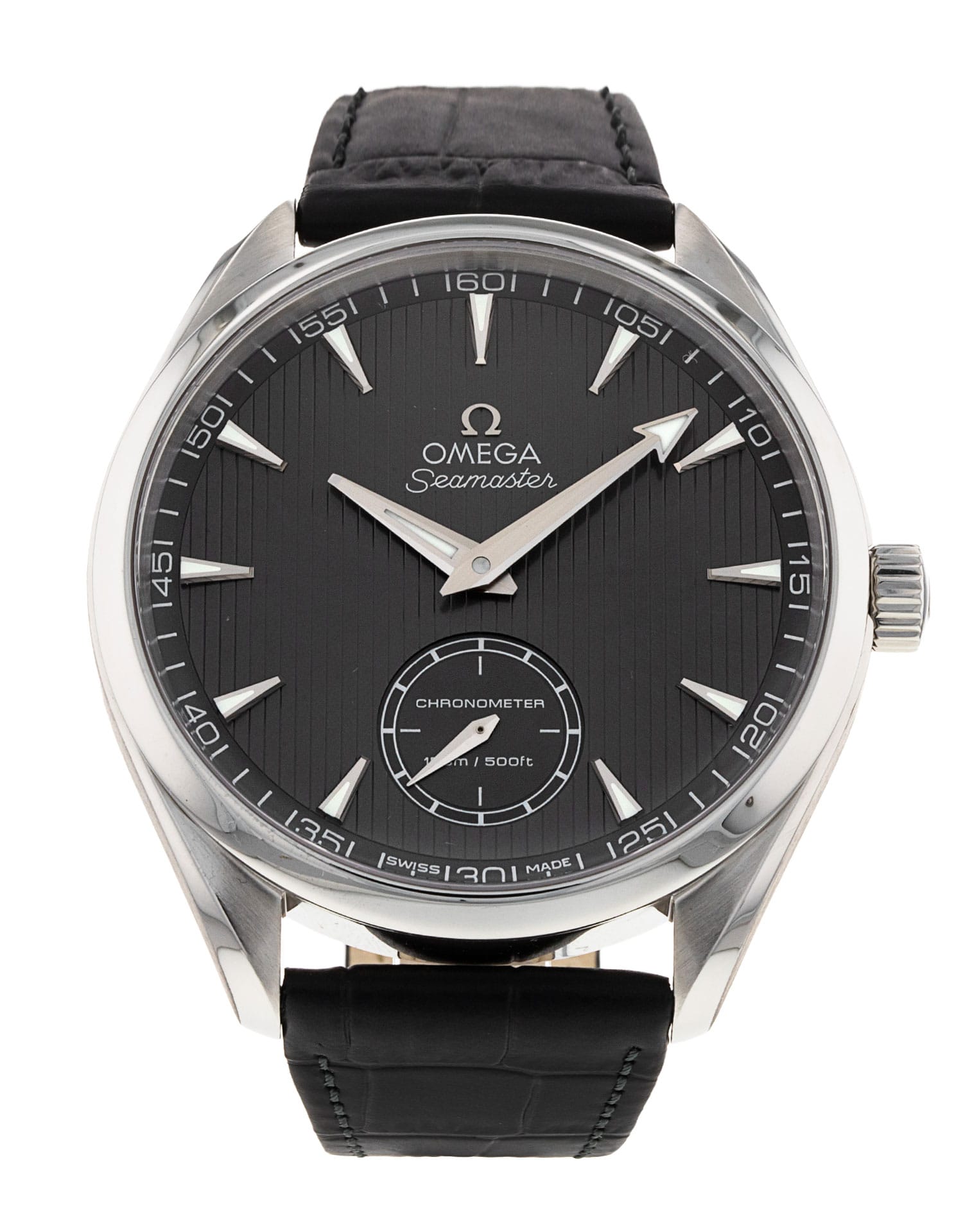 This Omega Aqua Terra 150m Gents 231.13.49.10.06.001 has a grey baton dial and a leather strap. This Omega has undergone a thorough inspection of accuracy, functionality and condition at our Omega certified service centre to determine the level of reconditioning required to meet our strict standards. It has also been checked against our records to ensure authenticity. All our watches have a 24-month warranty for your peace of mind.