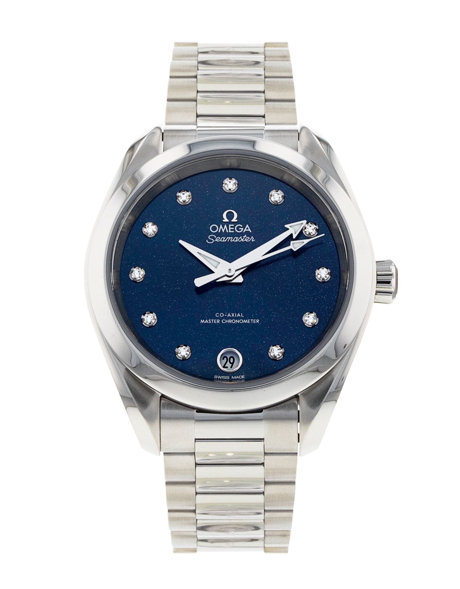This Omega Aqua Terra 150m Ladies 220.10.34.20.53.001 has a blue diamond dial and a bracelet strap. This Omega has undergone a thorough inspection of accuracy, functionality and condition at our Omega certified service centre to determine the level of reconditioning required to meet our strict standards. It has also been checked against our records to ensure authenticity. Our watches have a 24-month warranty for your peace of mind, in conjunction with any remaining manufacturer’s warranty from new or from service.