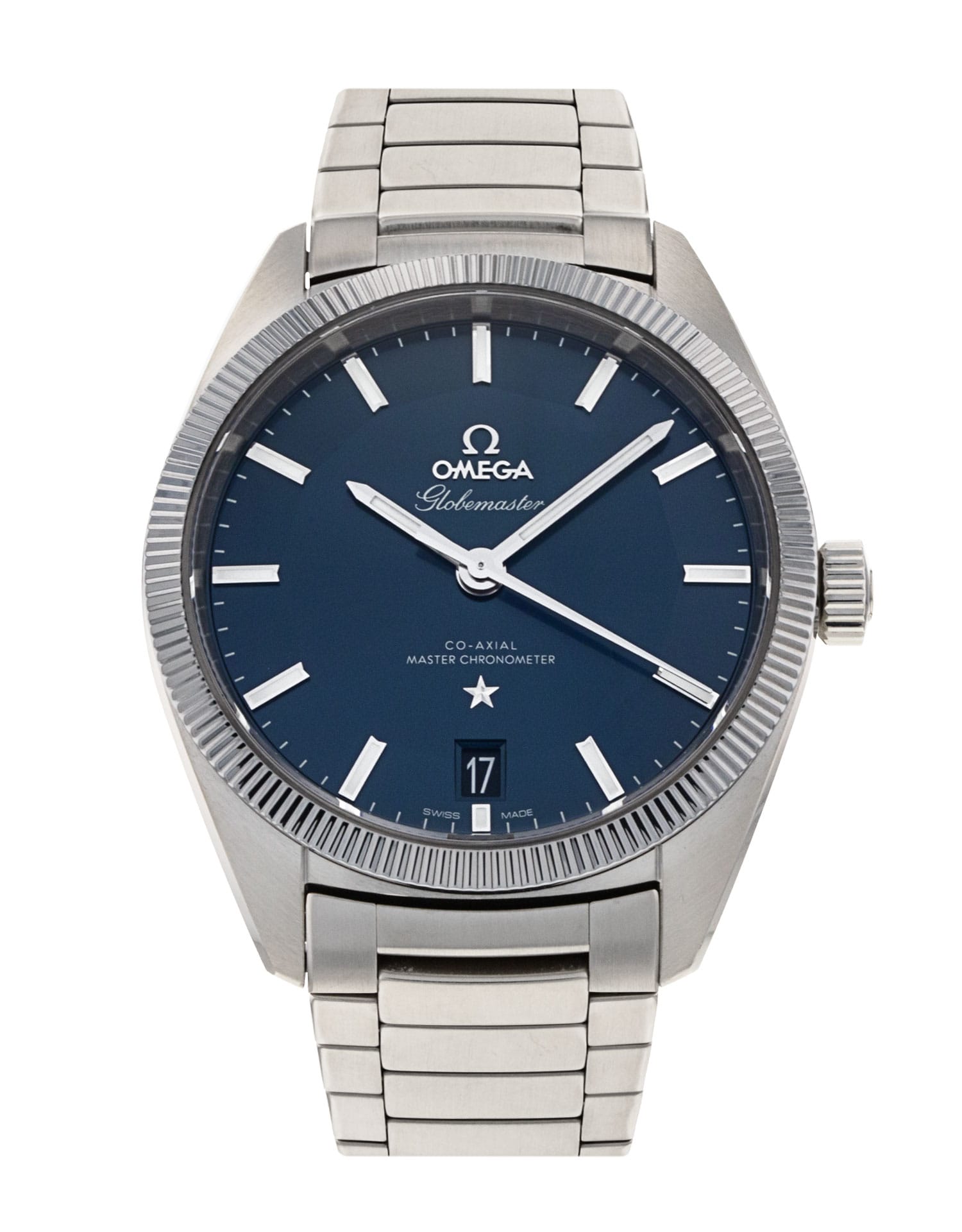 This Omega Constellation Globemaster 130.30.39.21.03.001 has a blue baton dial and a bracelet strap. This Omega has undergone a thorough inspection of accuracy, functionality and condition at our Omega certified service centre to determine the level of reconditioning required to meet our strict standards. It has also been checked against our records to ensure authenticity. All our watches have a 24-month warranty for your peace of mind.