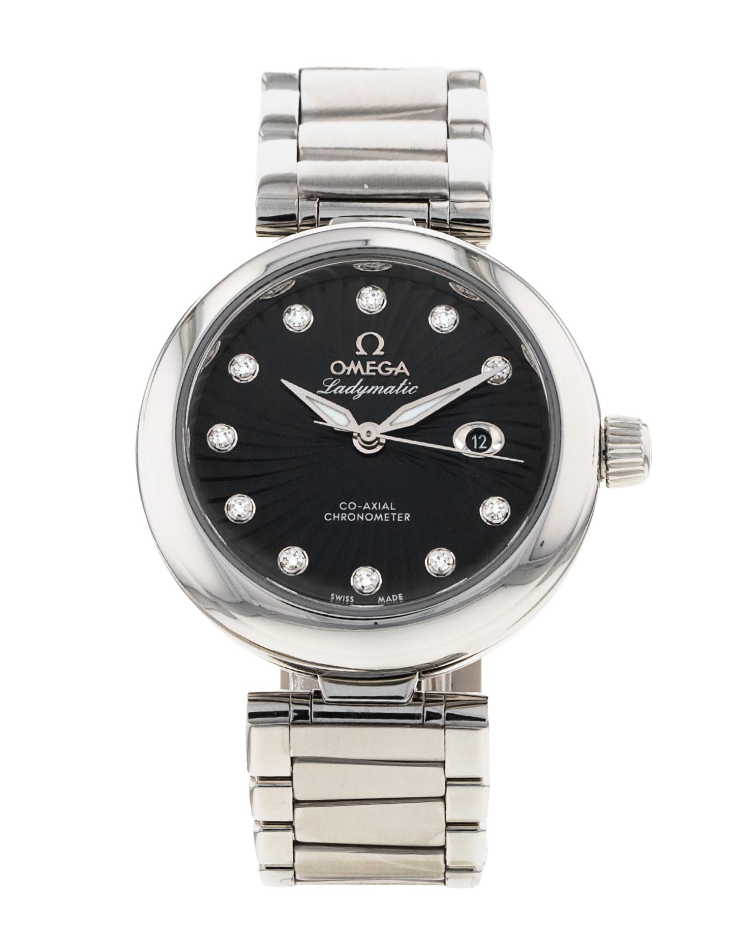 This Omega De Ville Ladymatic 425.30.34.20.51.001 has a black diamond dial and a bracelet strap. This Omega has undergone a thorough inspection of accuracy, functionality and condition at our Omega certified service centre to determine the level of reconditioning required to meet our strict standards. It has also been checked against our records to ensure authenticity. All our watches have a 24-month warranty for your peace of mind.