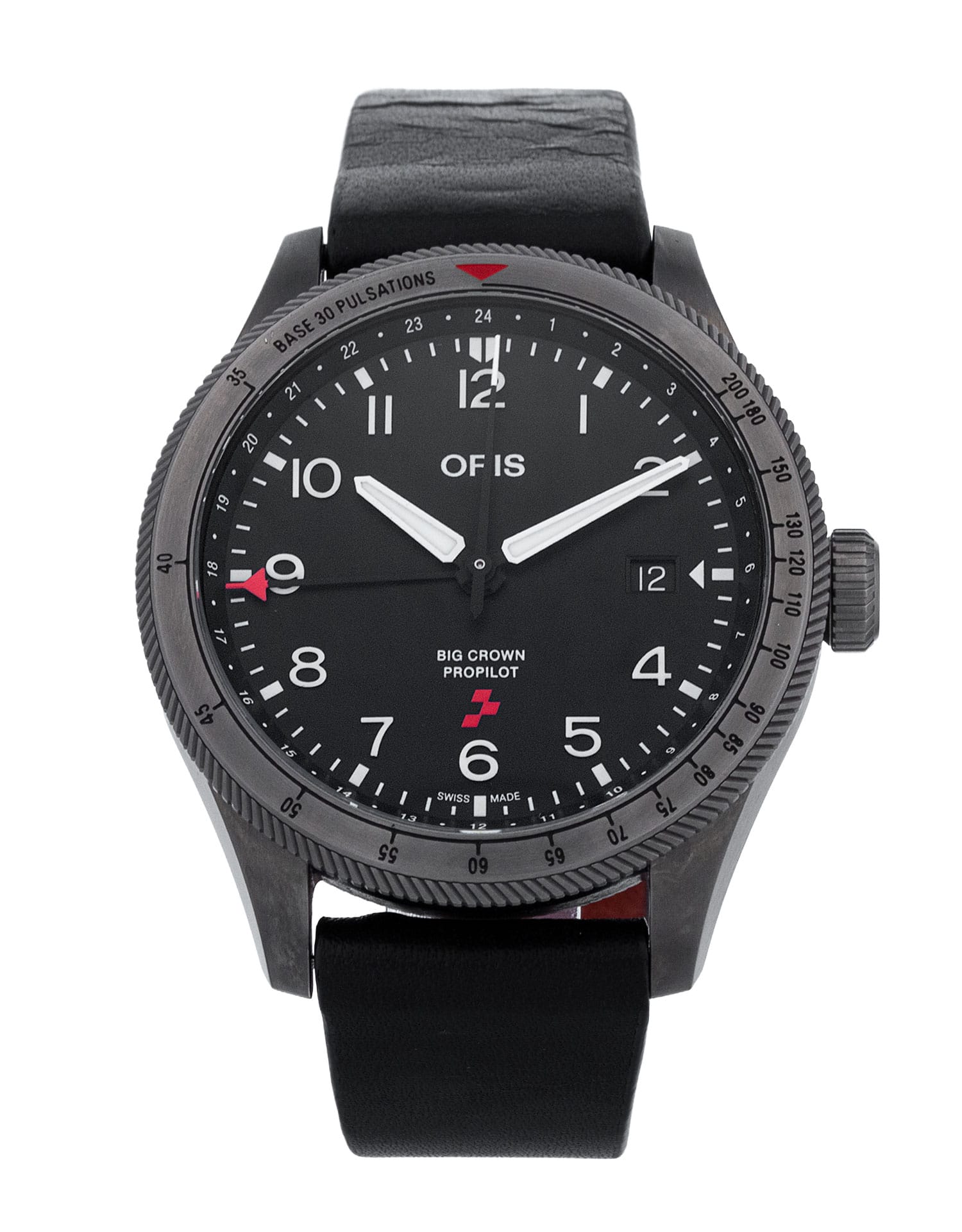 This Oris Big Crown ProPilot 01 798 7773 4284 HB-ZRS-Set has a black arabic dial and a leather strap. This Oris has undergone a thorough inspection of water resistance, accuracy, functionality and condition to determine the level of reconditioning required to meet our strict standards. It has also been referenced against technical documents and manufacturer records where available to ensure authenticity and a clean history. All our watches have a 24-month warranty for your peace of mind.
