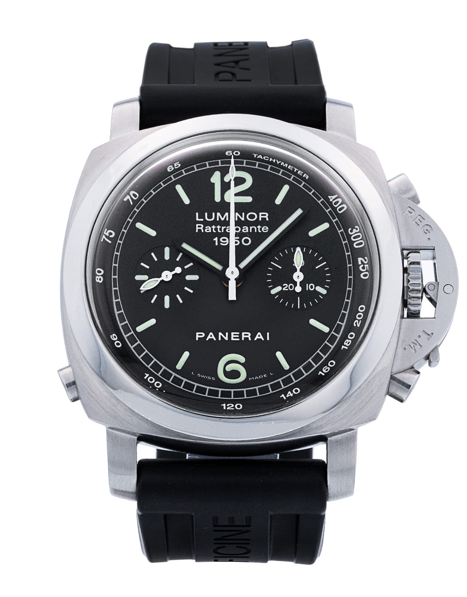 This Panerai Luminor 1950 PAM00213 has a black baton dial and a rubber strap. This Panerai has undergone a thorough inspection of accuracy, functionality and condition at our Panerai certified service centre to determine the level of reconditioning required to meet our strict standards. It has also been checked against our records to ensure authenticity. All our watches have a 24-month warranty for your peace of mind.