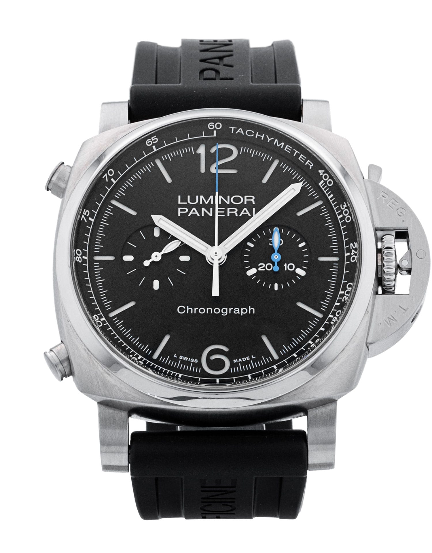 This Panerai Luminor Chrono PAM01109 has a black baton dial and a rubber strap. This Panerai has undergone a thorough inspection of accuracy, functionality and condition at our Panerai certified service centre to determine the level of reconditioning required to meet our strict standards. It has also been checked against our records to ensure authenticity. All our watches have a 24-month warranty for your peace of mind.