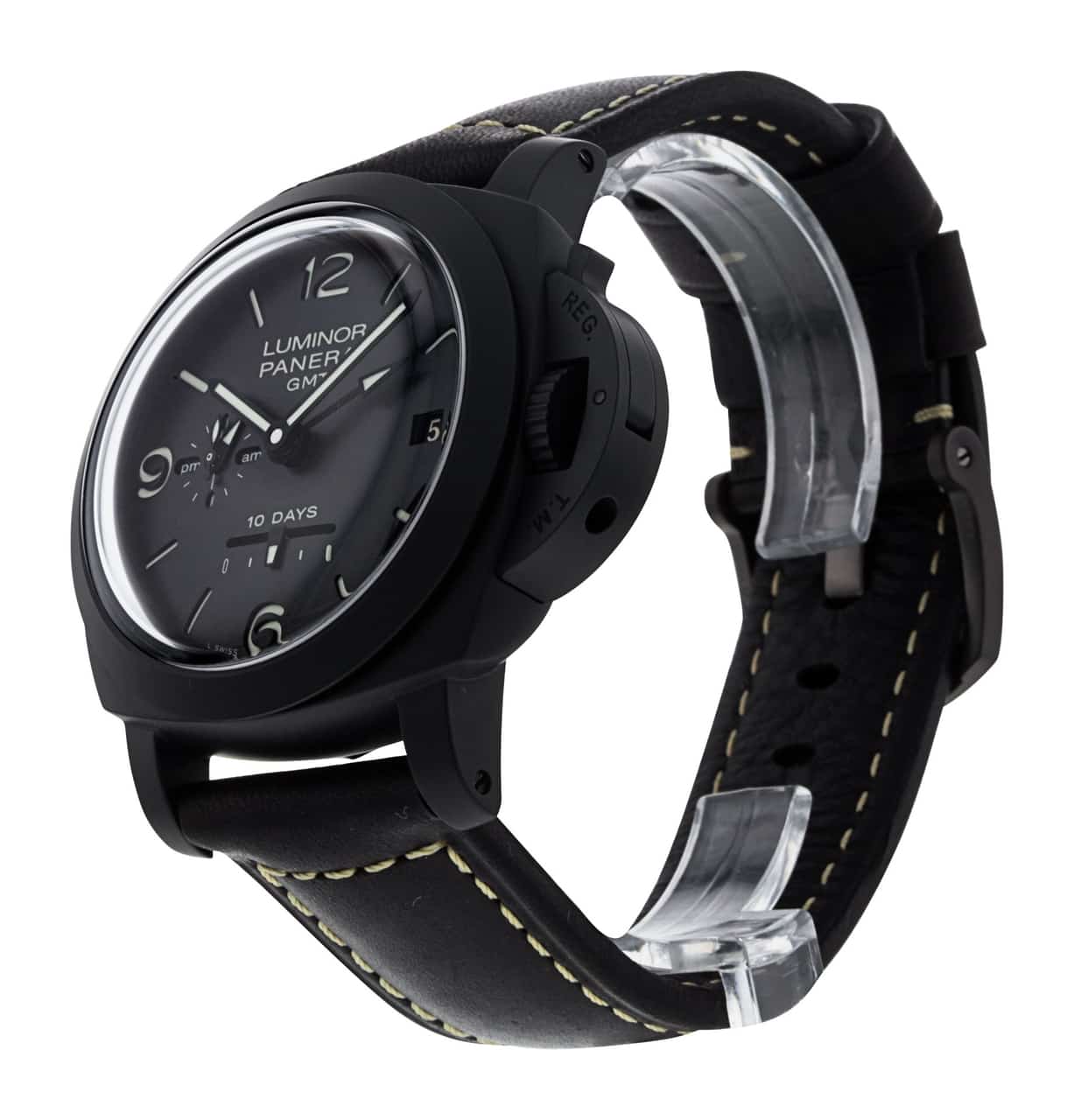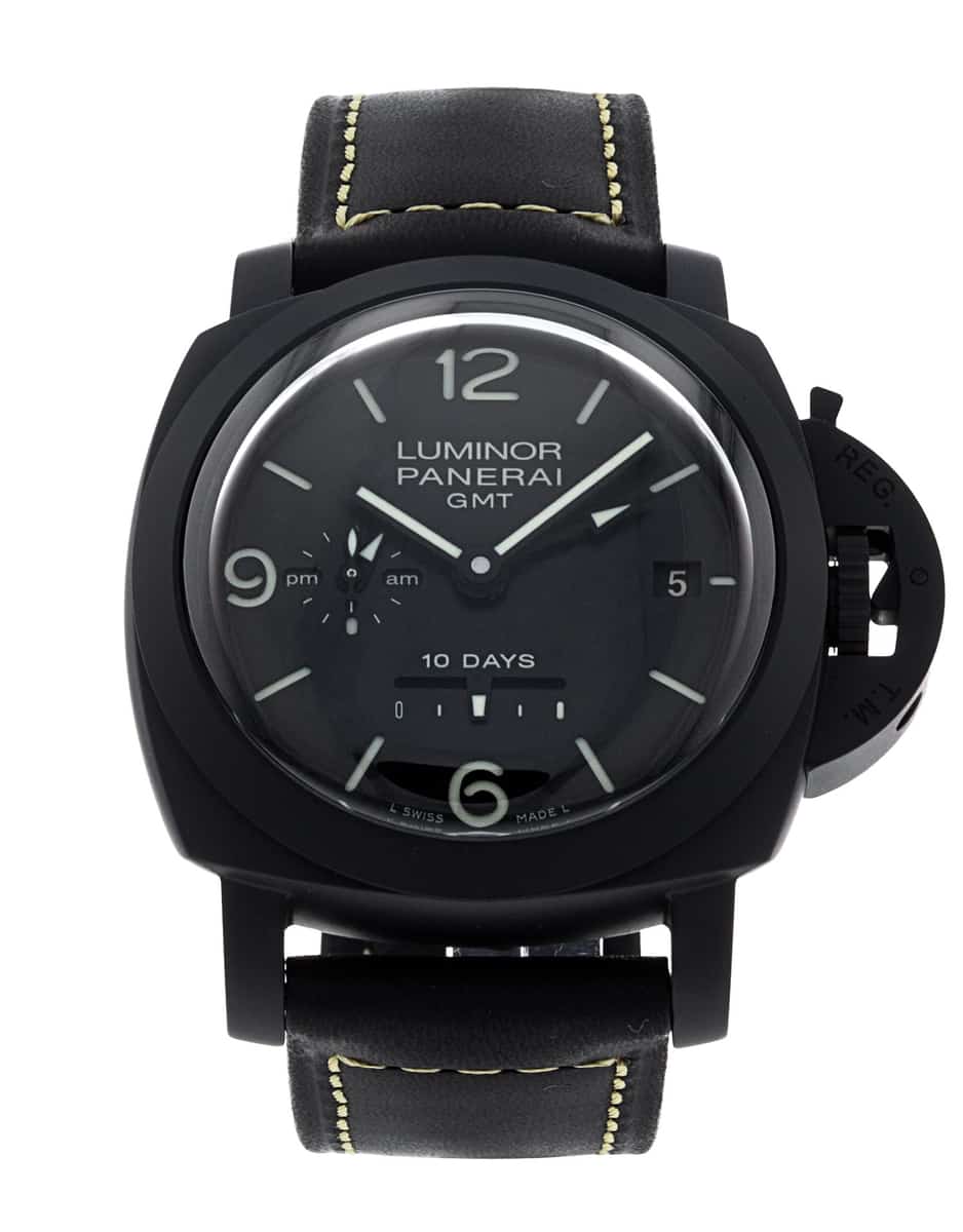 This Panerai Luminor GMT PAM00335 has a black baton dial and a leather strap. This Panerai has undergone a thorough inspection of accuracy, functionality and condition at our Panerai certified service centre to determine the level of reconditioning required to meet our strict standards. It has also been checked against our records to ensure authenticity. All our watches have a 24-month warranty for your peace of mind.