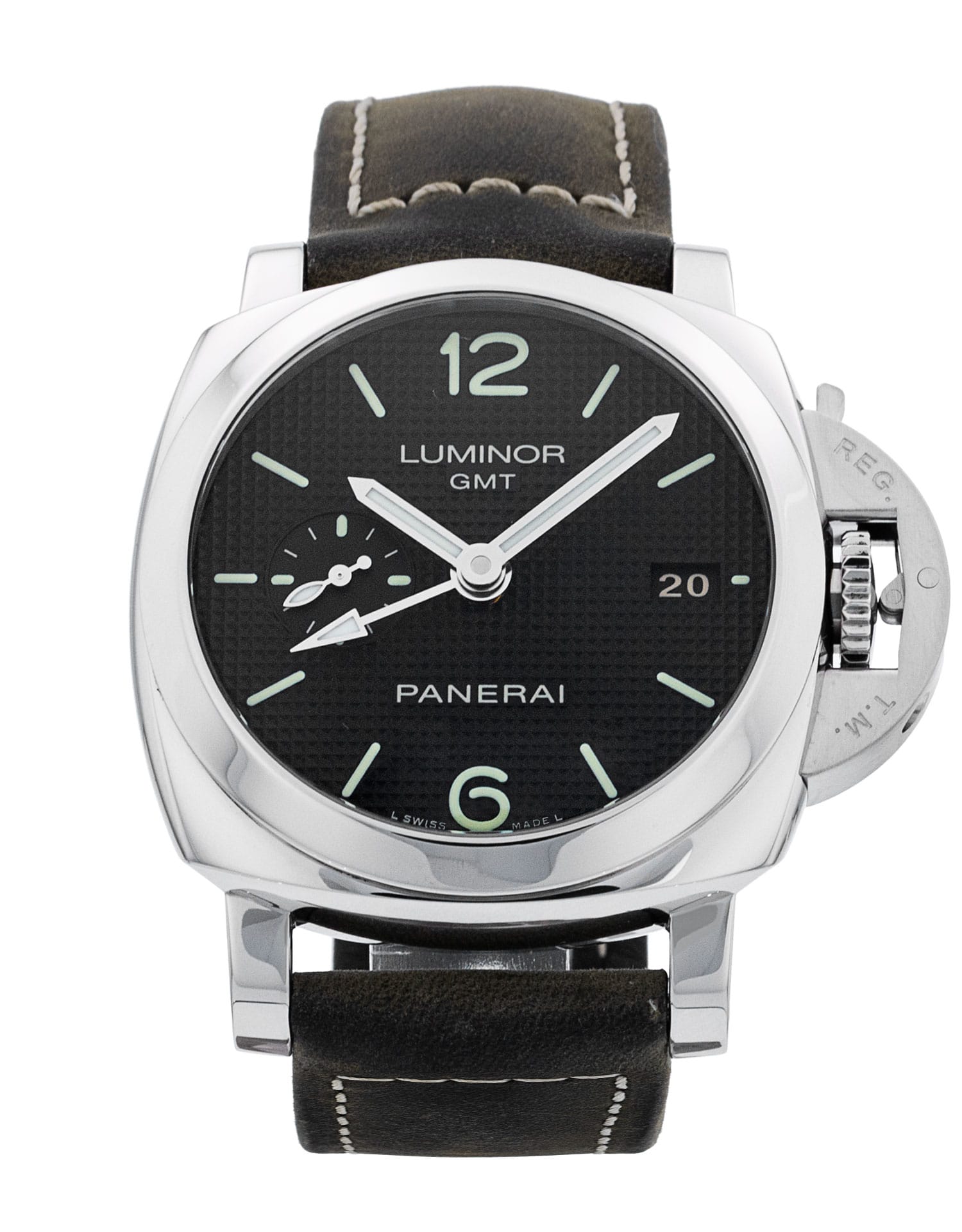 This Panerai Luminor GMT PAM00535 has a black baton dial and a leather strap. This Panerai has undergone a thorough inspection of accuracy, functionality and condition at our Panerai certified service centre to determine the level of reconditioning required to meet our strict standards. It has also been checked against our records to ensure authenticity. All our watches have a 24-month warranty for your peace of mind.