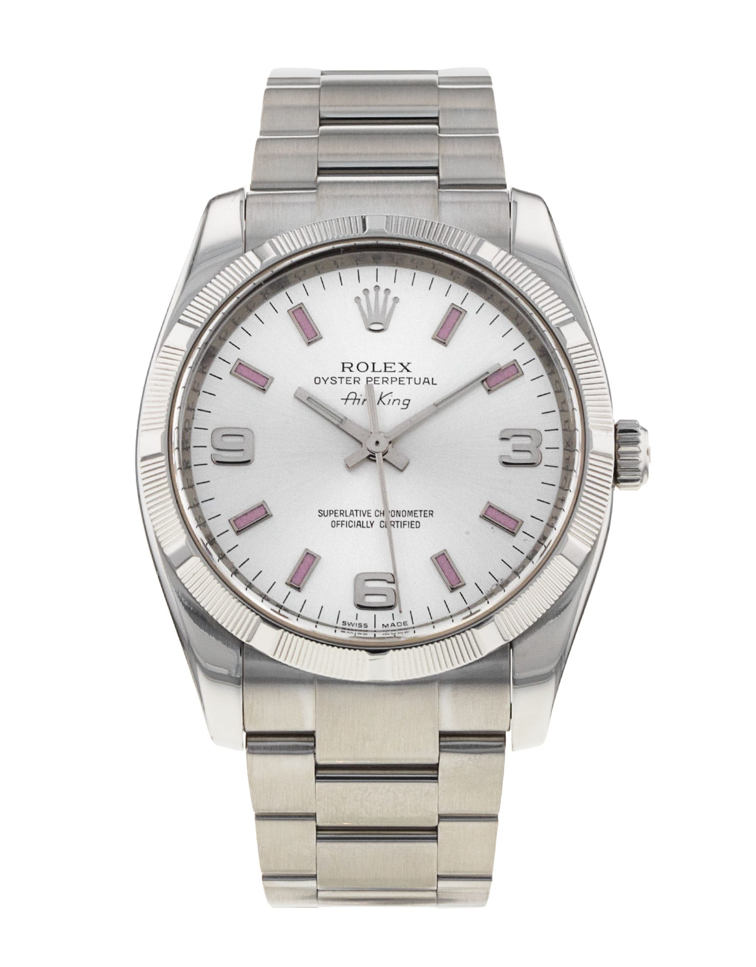 This Rolex Air-King 114210 has a silver quarter arabic dial and a bracelet strap. This Rolex has undergone a thorough inspection of water resistance, accuracy, functionality and condition to determine the level of reconditioning required to meet our strict standards. It has also been referenced against technical documents and manufacturer records where available to ensure authenticity and a clean history. All our watches have a 24-month warranty for your peace of mind. One of our skilled polishing technicians has removed marks on the case and bracelet of this watch, brought about by daily wear and tear, which is why this watch does not come with the remaining manufacturer’s warranty.