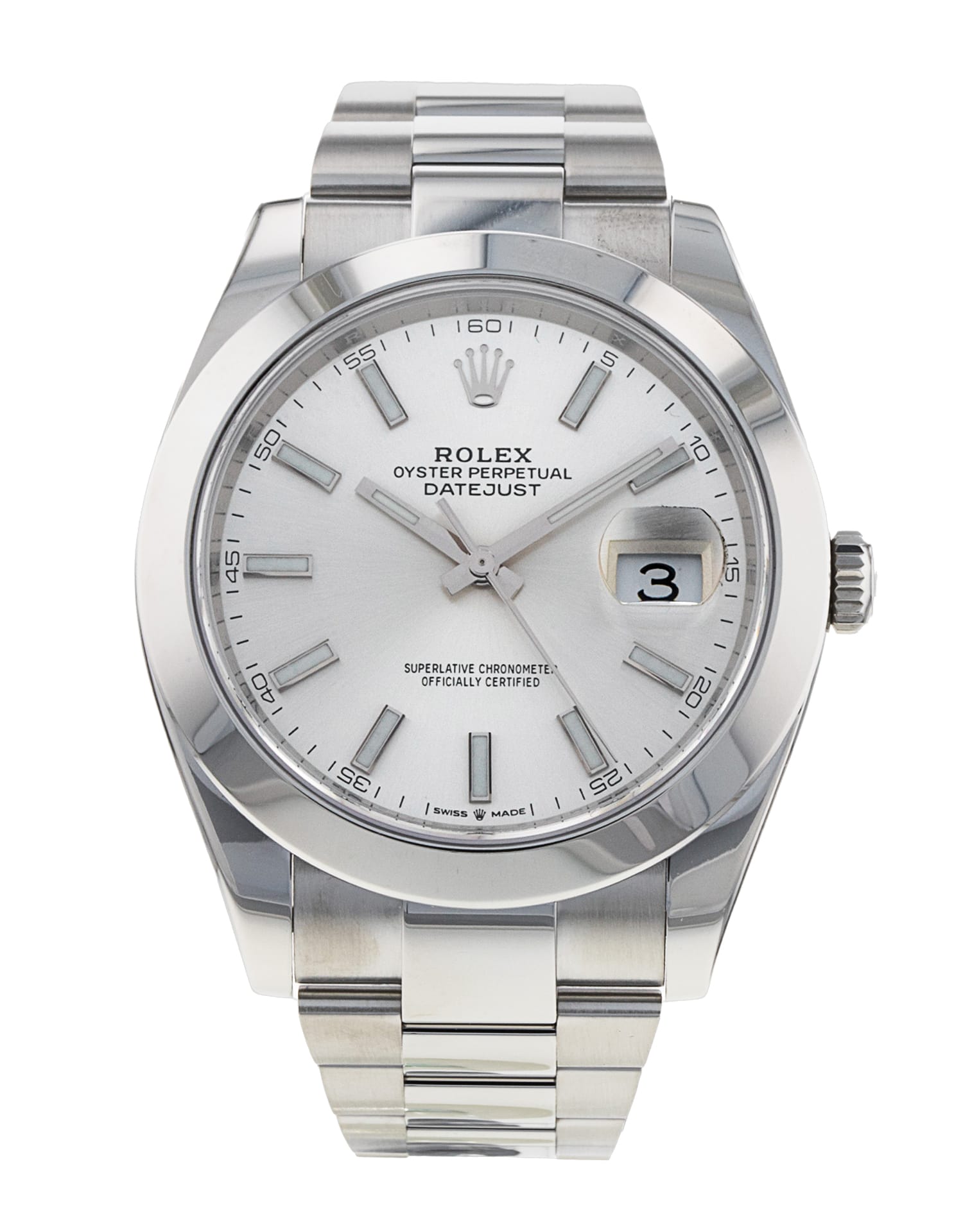 This Rolex Datejust 41 126300 has a silver baton dial and a bracelet strap. This Rolex has undergone a thorough inspection of water resistance, accuracy, functionality and condition to determine the level of reconditioning required to meet our strict standards. It has also been referenced against technical documents and manufacturer records where available to ensure authenticity and a clean history. All our watches have a 24-month warranty for your peace of mind. One of our skilled polishing technicians has removed marks on the case and bracelet of this watch, brought about by daily wear and tear, which is why this watch does not come with the remaining manufacturer’s warranty.