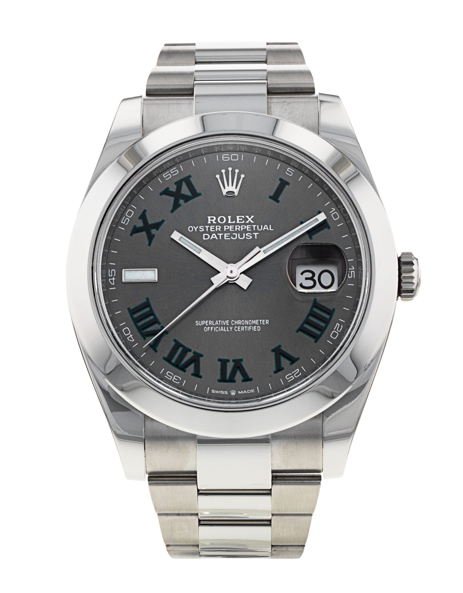 This Rolex Datejust 41 126300 has a slate roman numeral dial and a bracelet strap. This Rolex has undergone a thorough inspection of water resistance, accuracy, functionality and condition to determine the level of reconditioning required to meet our strict standards. It has also been referenced against technical documents and manufacturer records where available to ensure authenticity and a clean history. All our watches have a 24-month warranty for your peace of mind. One of our skilled polishing technicians has removed marks on the case and bracelet of this watch, brought about by daily wear and tear, which is why this watch does not come with the remaining manufacturer’s warranty.