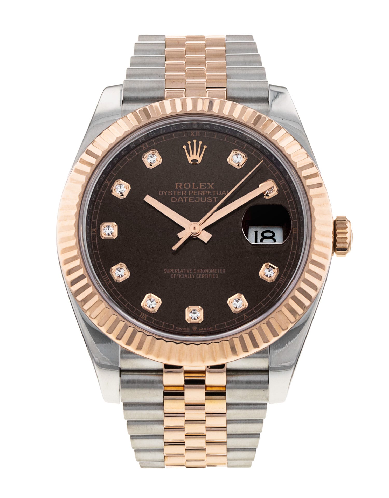 This Rolex Datejust 41 126331 has a chocolate diamond dial and a bracelet strap. This Rolex has undergone a thorough inspection of water resistance, accuracy, functionality and condition to determine the level of reconditioning required to meet our strict standards. It has also been referenced against technical documents and manufacturer records where available to ensure authenticity and a clean history. All our watches have a 24-month warranty for your peace of mind. One of our skilled polishing technicians has removed marks on the case and bracelet of this watch, brought about by daily wear and tear, which is why this watch does not come with the remaining manufacturer’s warranty.