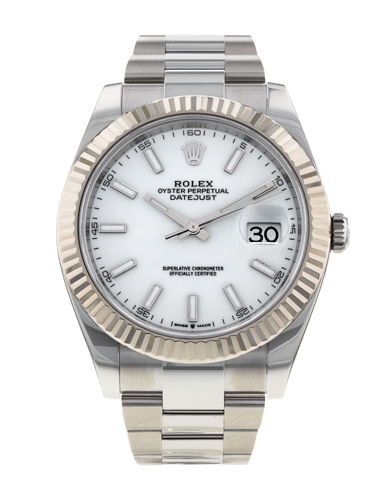 This Rolex Datejust 41 126334 has a white baton dial and a bracelet strap. This Rolex has undergone a thorough inspection of water resistance, accuracy, functionality and condition to determine the level of reconditioning required to meet our strict standards. It has also been referenced against technical documents and manufacturer records where available to ensure authenticity and a clean history. All our watches have a 24-month warranty for your peace of mind. One of our skilled polishing technicians has removed marks on the case and bracelet of this watch, brought about by daily wear and tear, which is why this watch does not come with the remaining manufacturer’s warranty.