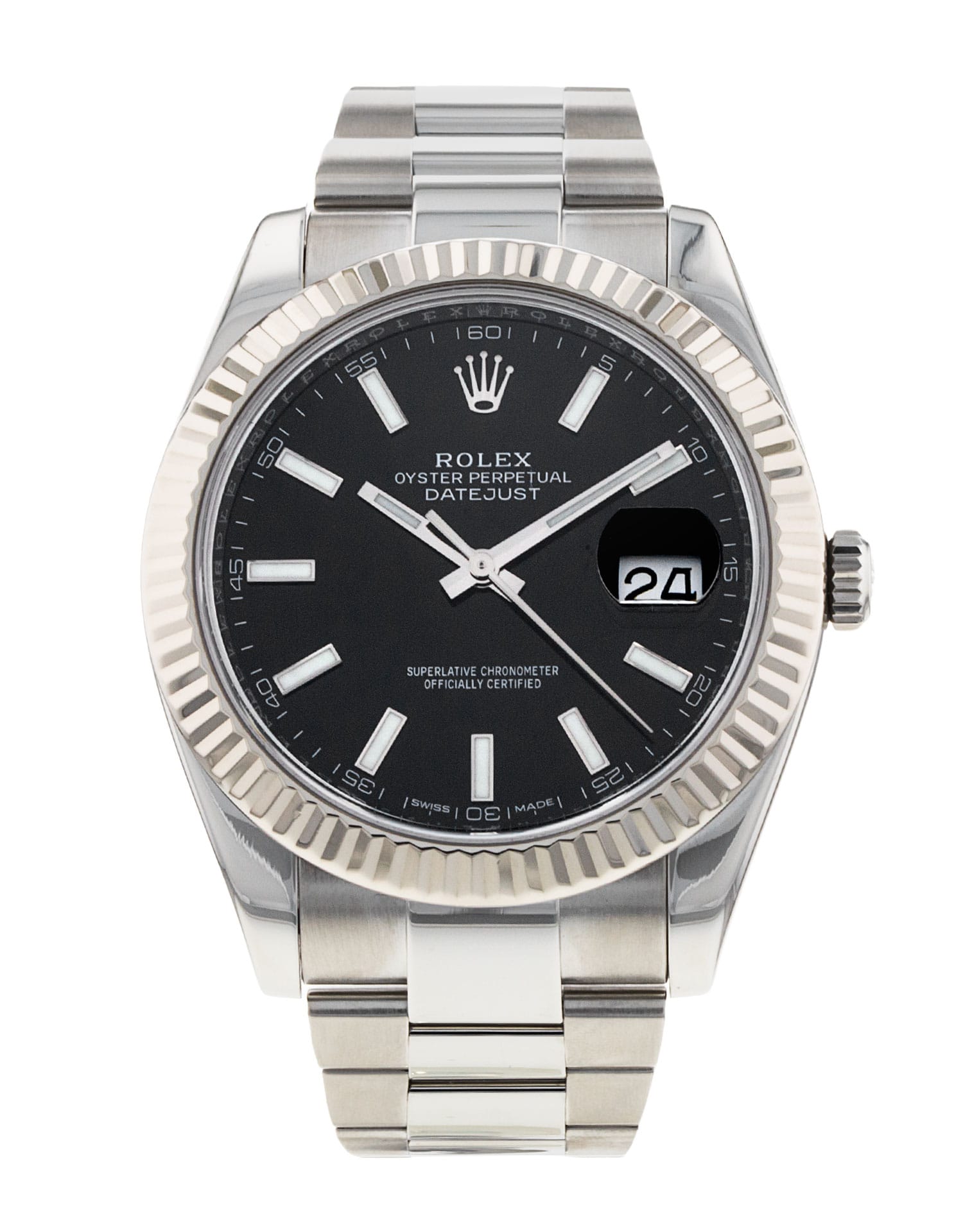 This Rolex Datejust 41 126334 has a black baton dial and a bracelet strap. This Rolex has undergone a thorough inspection of water resistance, accuracy, functionality and condition to determine the level of reconditioning required to meet our strict standards. It has also been referenced against technical documents and manufacturer records where available to ensure authenticity and a clean history. All our watches have a 24-month warranty for your peace of mind. One of our skilled polishing technicians has removed marks on the case and bracelet of this watch, brought about by daily wear and tear, which is why this watch does not come with the remaining manufacturer’s warranty.