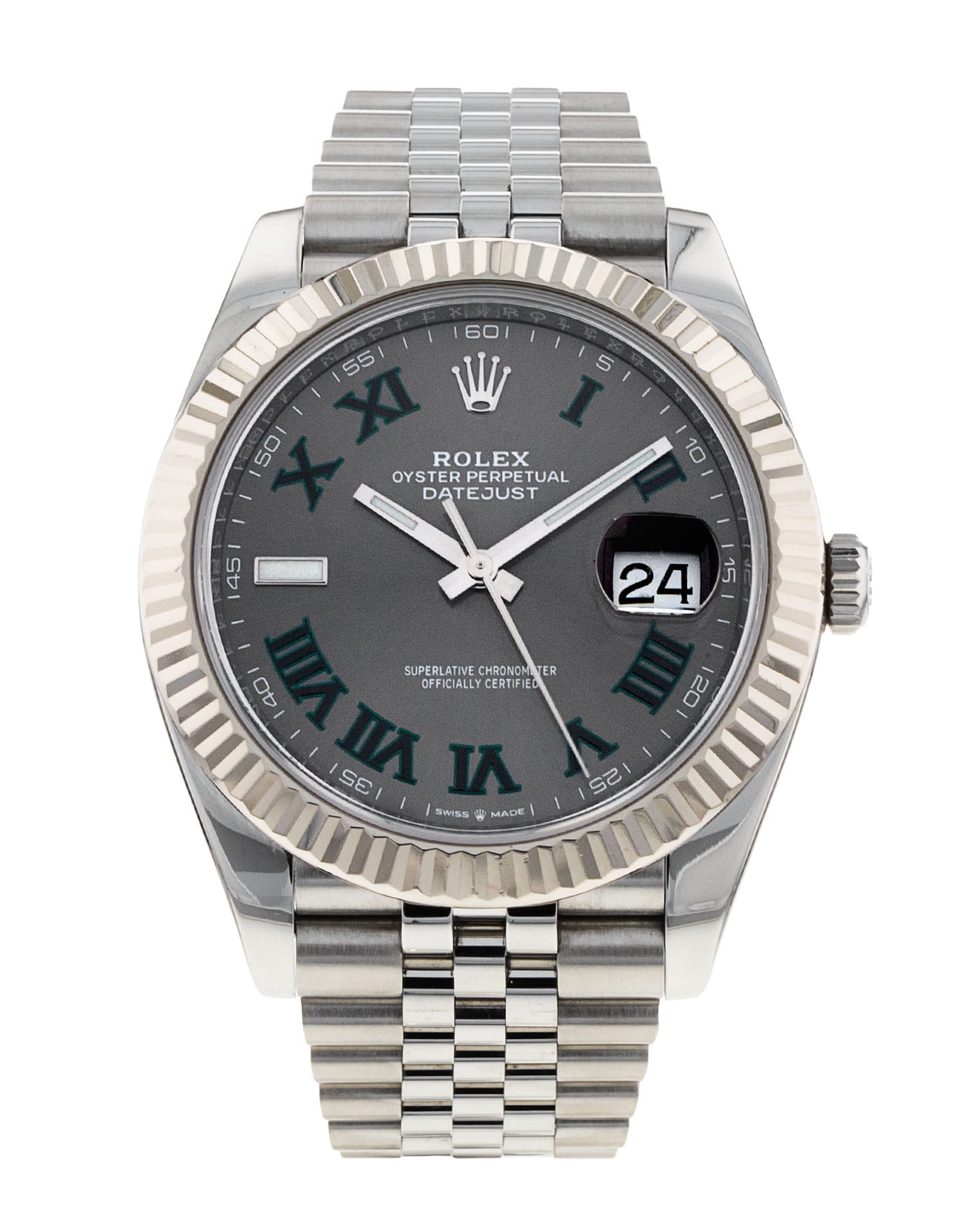 This Rolex Datejust 41 126334 has a slate roman numeral dial and a bracelet strap. This Rolex has undergone a thorough inspection of water resistance, accuracy, functionality and condition to determine the level of reconditioning required to meet our strict standards. It has also been referenced against technical documents and manufacturer records where available to ensure authenticity and a clean history. All our watches have a 24-month warranty for your peace of mind. One of our skilled polishing technicians has removed marks on the case and bracelet of this watch, brought about by daily wear and tear, which is why this watch does not come with the remaining manufacturer’s warranty.