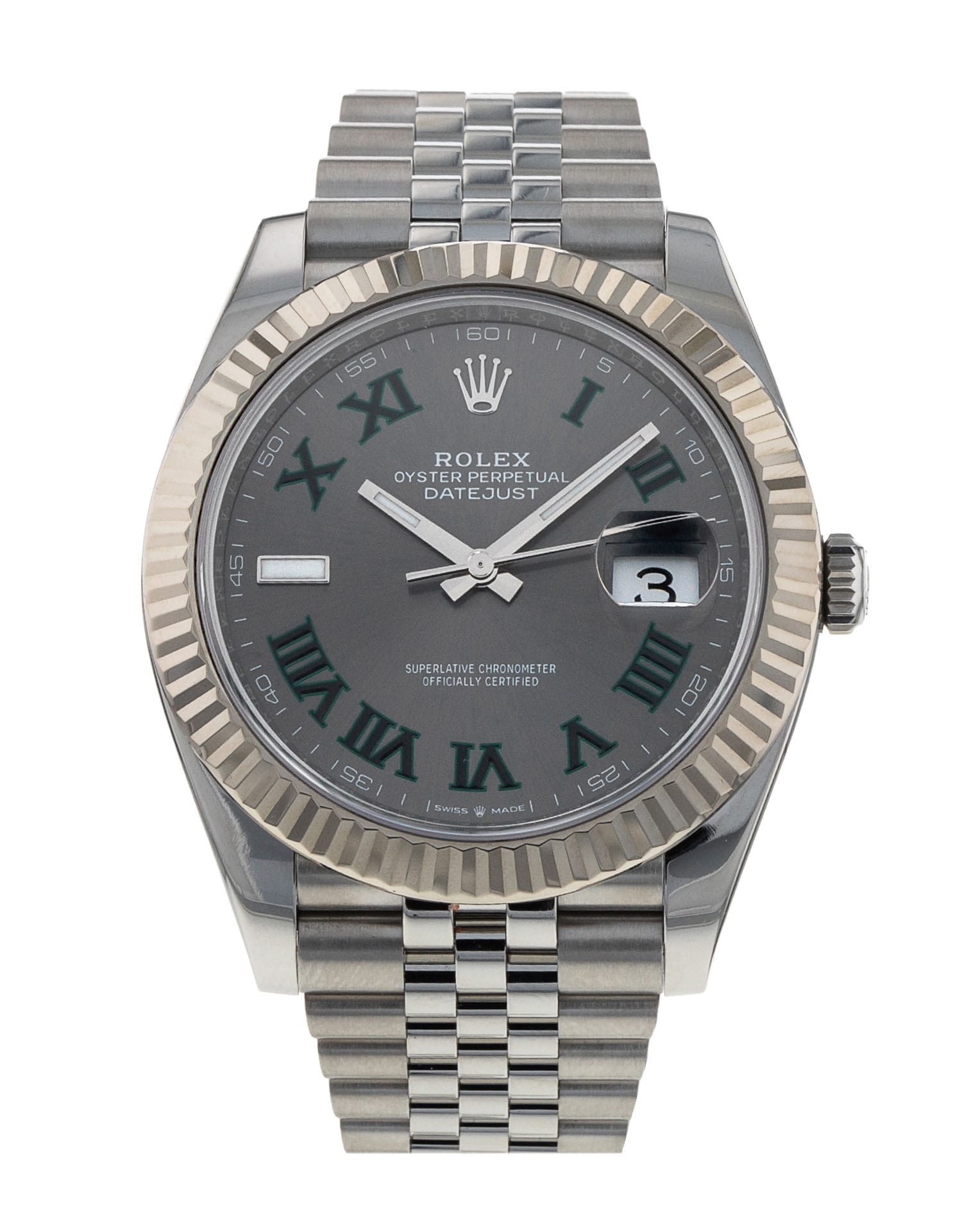 This Rolex Datejust 41 126334 has a slate roman numeral dial and a bracelet strap. This Rolex has undergone a thorough inspection of water resistance, accuracy, functionality and condition to determine the level of reconditioning required to meet our strict standards. It has also been referenced against technical documents and manufacturer records where available to ensure authenticity and a clean history. All our watches have a 24-month warranty for your peace of mind. One of our skilled polishing technicians has removed marks on the case and bracelet of this watch, brought about by daily wear and tear, which is why this watch does not come with the remaining manufacturer’s warranty.