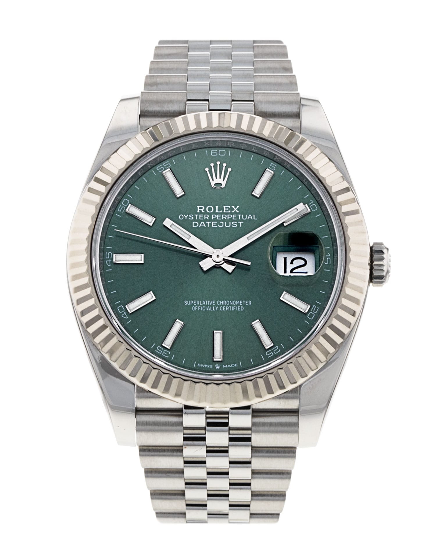 This Rolex Datejust 41 126334 has a mint green baton dial and a bracelet strap. This Rolex has undergone a thorough inspection of water resistance, accuracy, functionality and condition to determine the level of reconditioning required to meet our strict standards. It has also been referenced against technical documents and manufacturer records where available to ensure authenticity and a clean history. All our watches have a 24-month warranty for your peace of mind. One of our skilled polishing technicians has removed marks on the case and bracelet of this watch, brought about by daily wear and tear, which is why this watch does not come with the remaining manufacturer’s warranty.