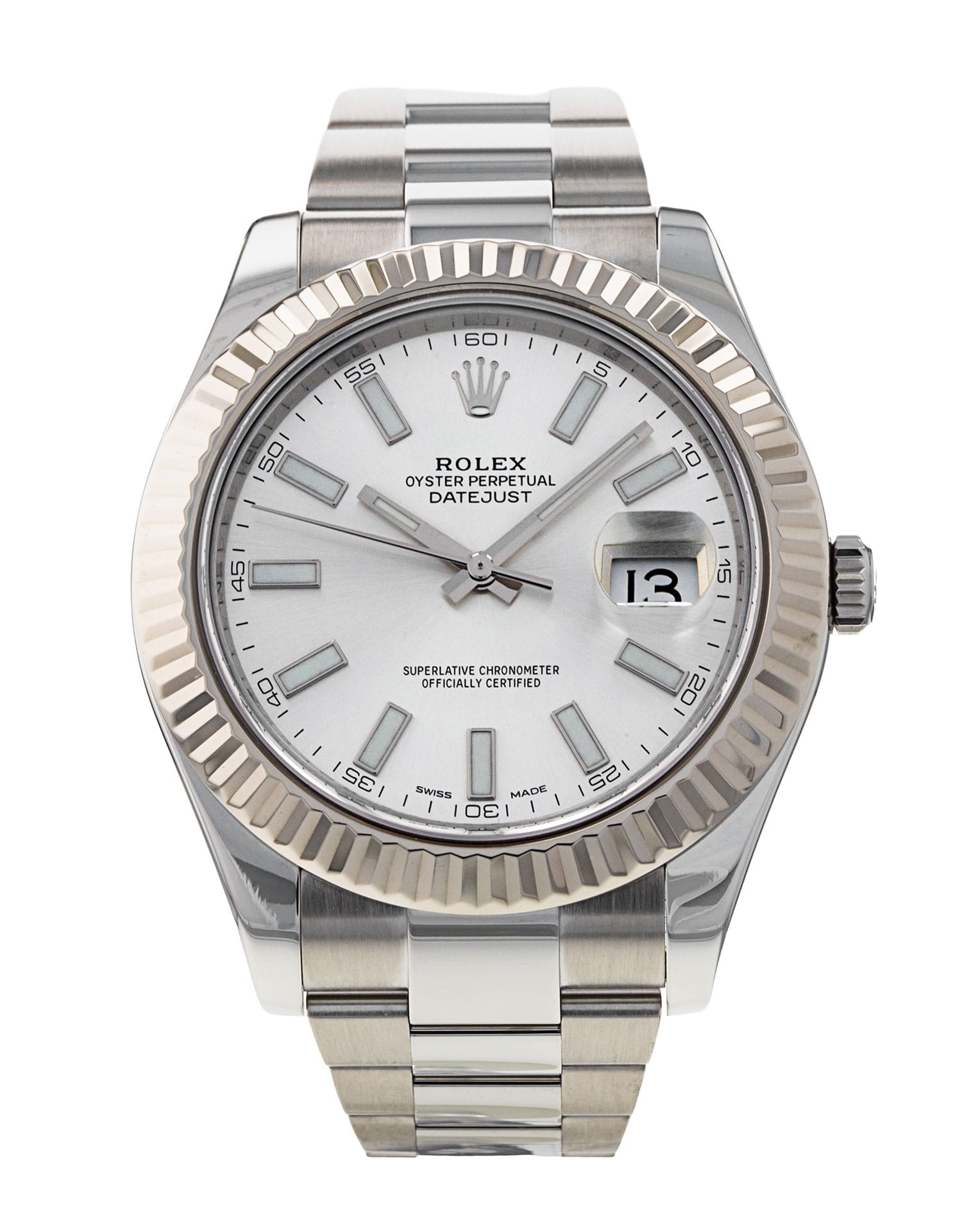 This Rolex Datejust II 116334 has a silver baton dial and a bracelet strap. This Rolex has undergone a thorough inspection of water resistance, accuracy, functionality and condition to determine the level of reconditioning required to meet our strict standards. It has also been referenced against technical documents and manufacturer records where available to ensure authenticity and a clean history. All our watches have a 24-month warranty for your peace of mind. One of our skilled polishing technicians has removed marks on the case and bracelet of this watch, brought about by daily wear and tear, which is why this watch does not come with the remaining manufacturer’s warranty.
