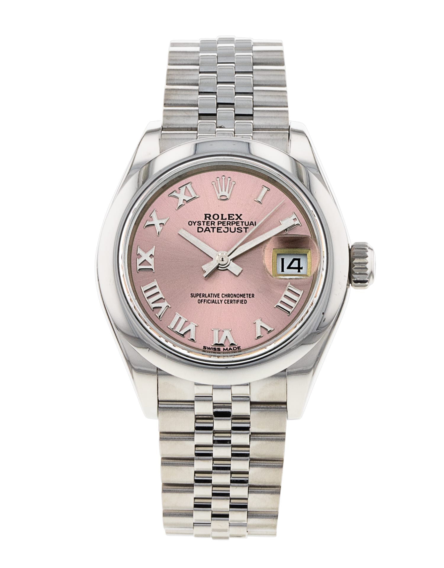 This Rolex Datejust Lady 28 279160 has a pink roman numeral dial and a bracelet strap. This Rolex has undergone a thorough inspection of water resistance, accuracy, functionality and condition to determine the level of reconditioning required to meet our strict standards. It has also been referenced against technical documents and manufacturer records where available to ensure authenticity and a clean history. All our watches have a 24-month warranty for your peace of mind. One of our skilled polishing technicians has removed marks on the case and bracelet of this watch, brought about by daily wear and tear, which is why this watch does not come with the remaining manufacturer’s warranty.