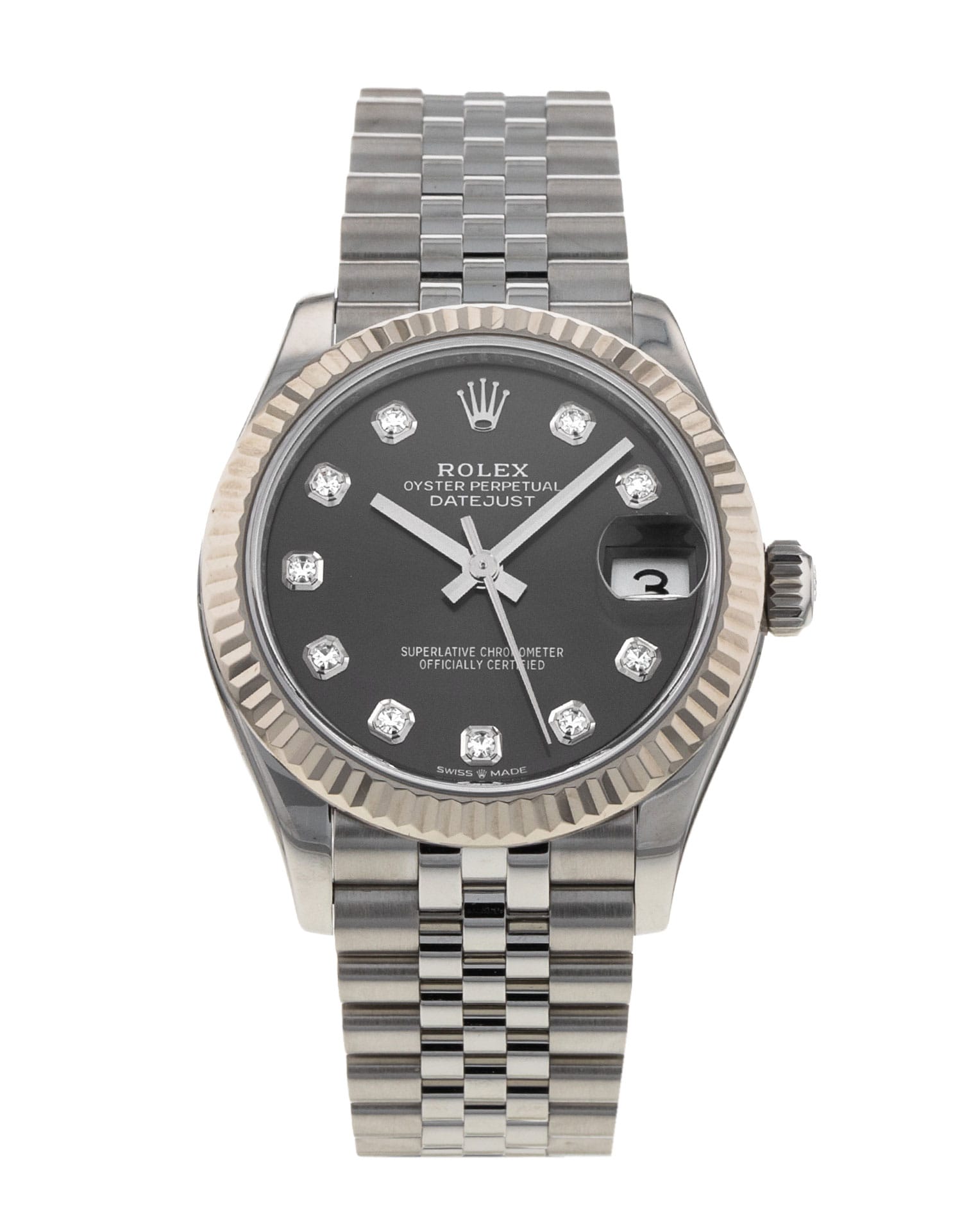 This Rolex Datejust Lady 31 278274 has a dark grey diamond dial and a bracelet strap. This Rolex has undergone a thorough inspection of water resistance, accuracy, functionality and condition to determine the level of reconditioning required to meet our strict standards. It has also been referenced against technical documents and manufacturer records where available to ensure authenticity and a clean history. Our watches have a 24-month warranty for your peace of mind, in conjunction with any remaining manufacturer’s warranty from new or from service. To maintain the manufacturer’s warranty on this watch, it has not been polished in our service centre.