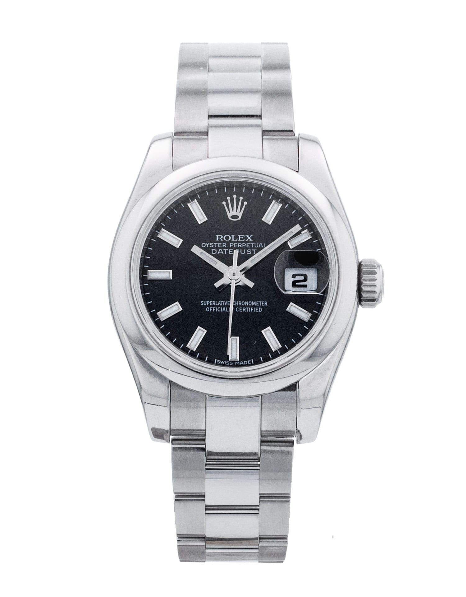 This Rolex Datejust Lady 179160 has a black baton dial and a bracelet strap. This Rolex has undergone a thorough inspection of water resistance, accuracy, functionality and condition to determine the level of reconditioning required to meet our strict standards. It has also been referenced against technical documents and manufacturer records where available to ensure authenticity and a clean history. All our watches have a 24-month warranty for your peace of mind. One of our skilled polishing technicians has removed marks on the case and bracelet of this watch, brought about by daily wear and tear, which is why this watch does not come with the remaining manufacturer’s warranty.